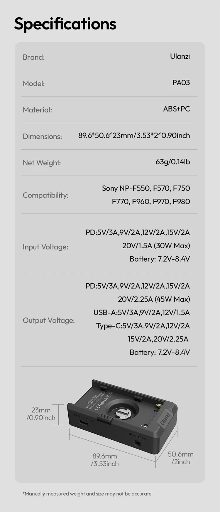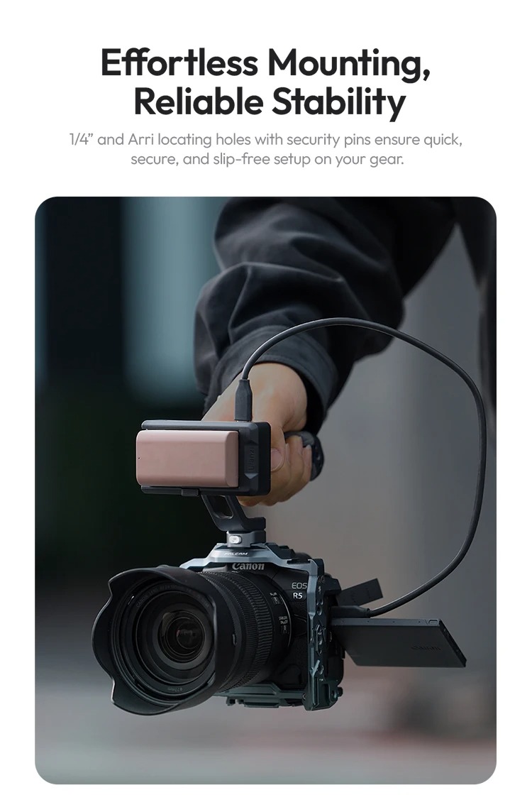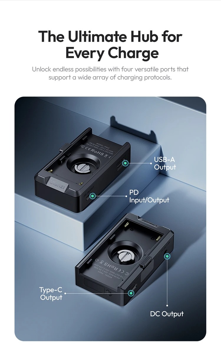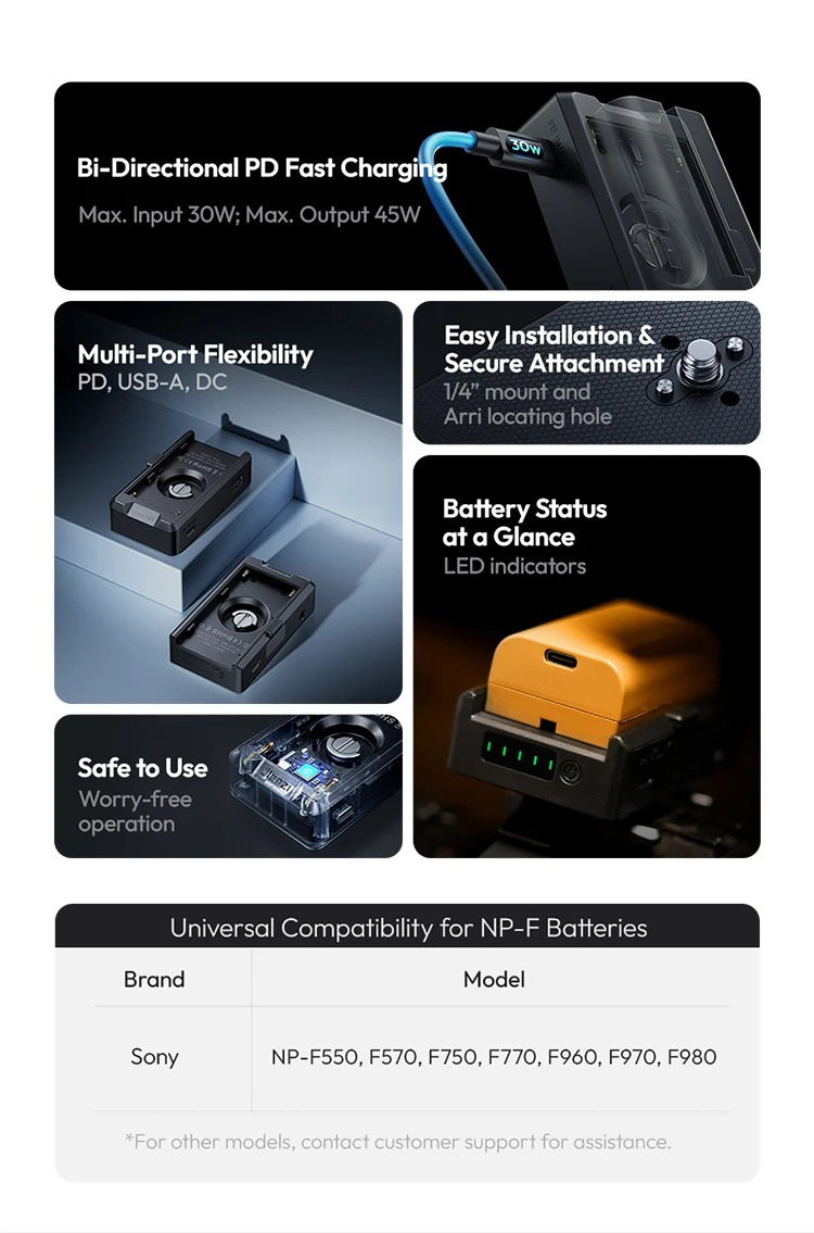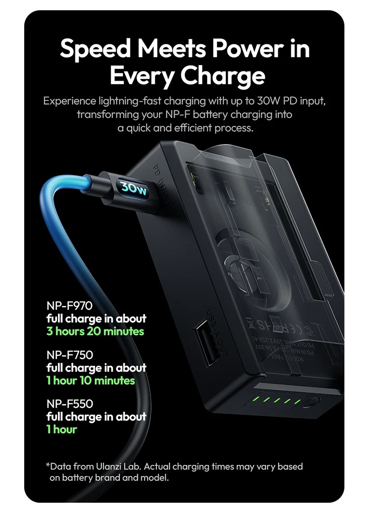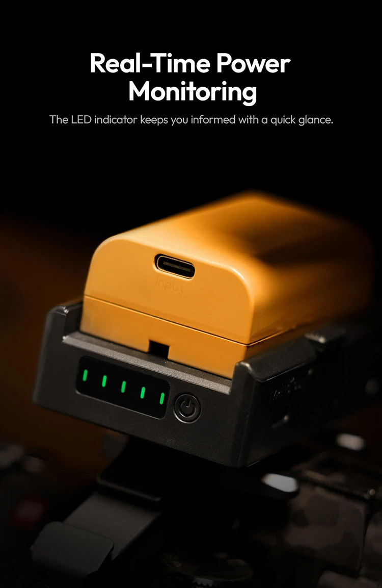 - Trải nghiệm sạc nhanh như chớp với đầu vào PD lên đến 30W, biến việc sạc pin NP-F của bạn thành một quá trình nhanh chóng và hiệu quả