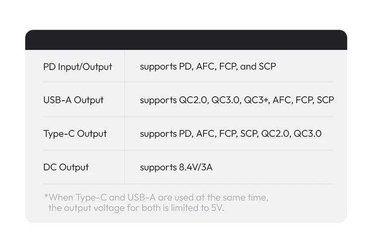 + USB-A: 5V/3A, 9V/2A, 12V/1.5A