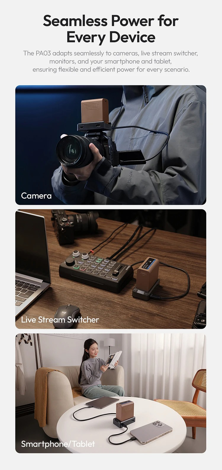 - Dòng sản phẩm PA03 tương thích hoàn hảo với máy ảnh, thiết bị chuyển đổi live stream, màn hình, cũng như điện thoại thông minh và máy tính bảng của bạn, đảm bảo nguồn điện linh hoạt và hiệu quả cho mọi tình huống.