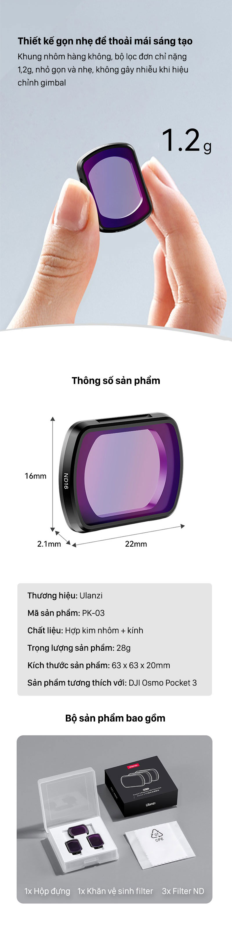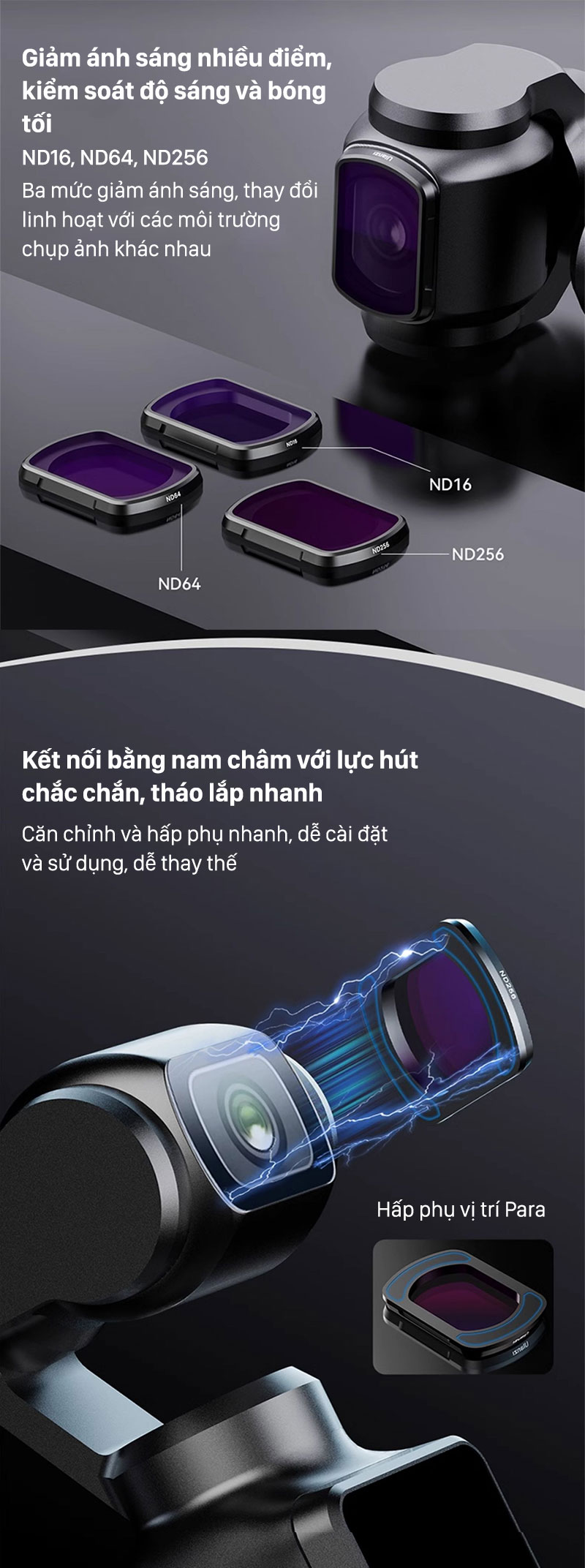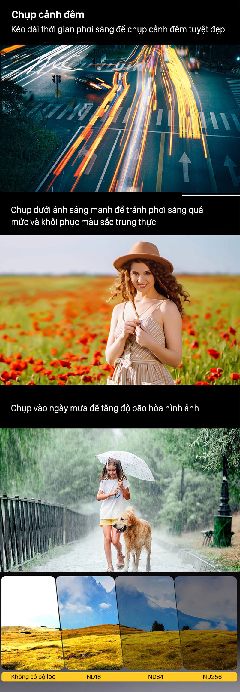 - Bộ kit bao gồm 3 filter ND16, ND64, và ND256. Có thể thay đổi linh hoạt với các môi trường chụp ảnh khác nhau.