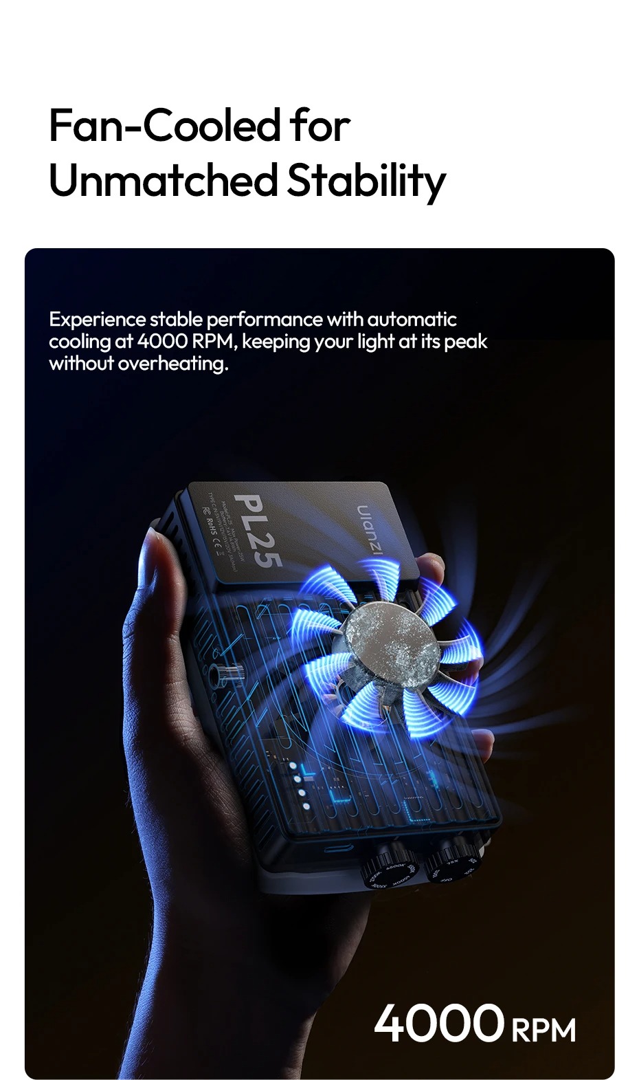- Tích hợp quạt tản nhiệt 4000rpm đảm bảo nhiệt độ ổn định trong quá trình sử dụng lâu dài.