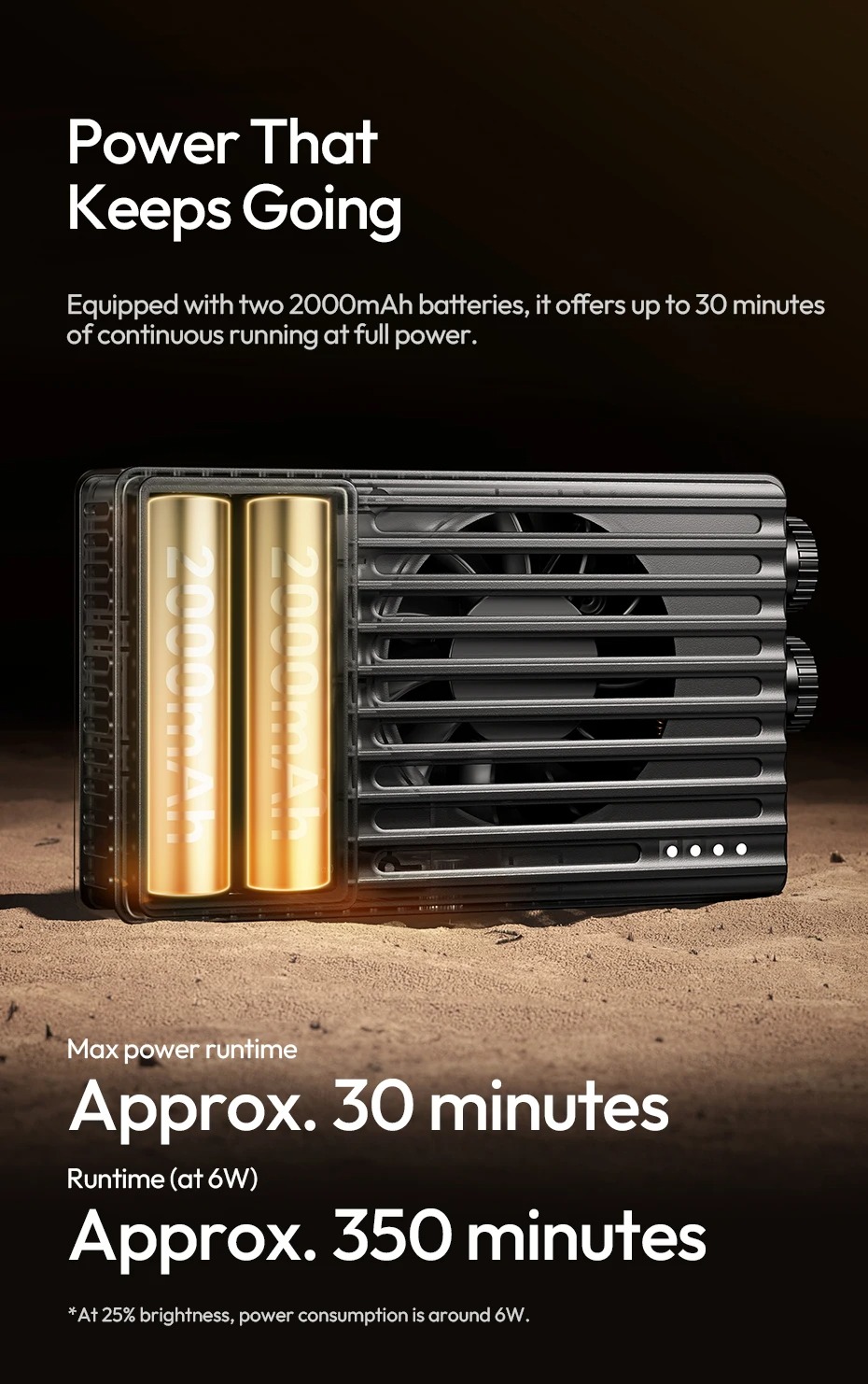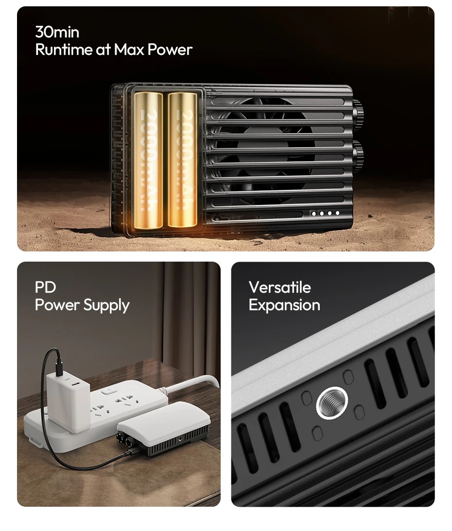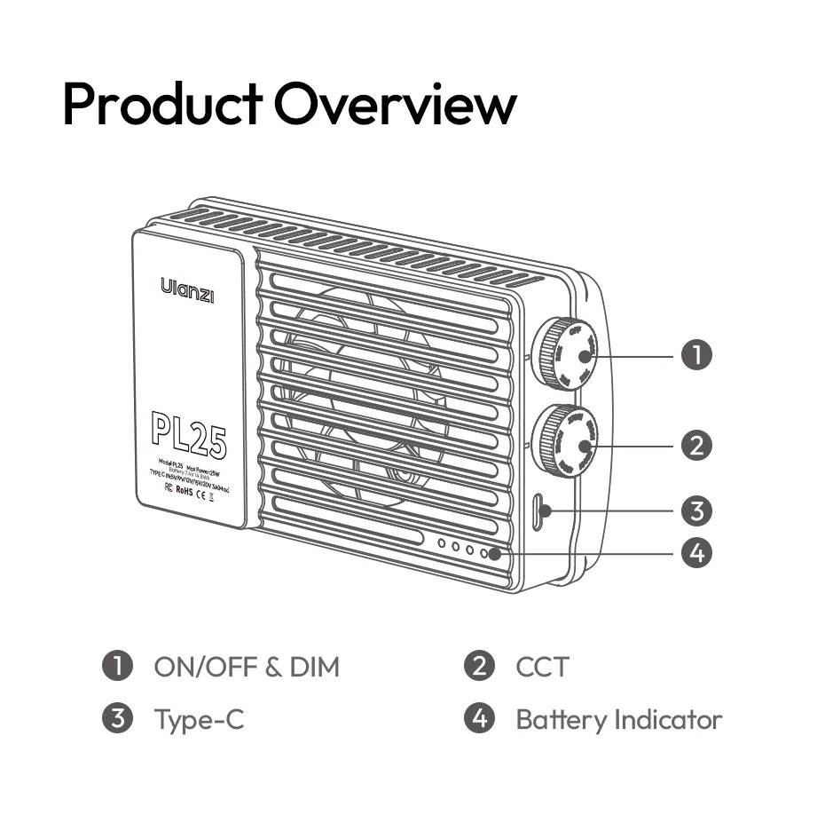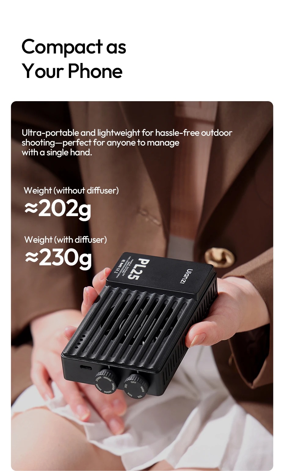 - Thiết kế cầm tay, gọn nhẹ nhưng công suất lên tới 25W đáp ứng nhu cầu quay chụp trong nhà và ngoại cảnh.
