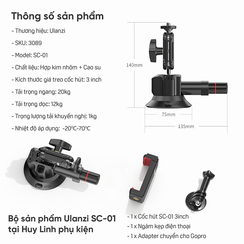 - Đi kèm với nhiều phụ kiện mở rộng có thể sử dụng với điện thoại di động, máy ảnh hành động, máy ảnh kỹ thuật số nhỏ (≤ 2kg).
