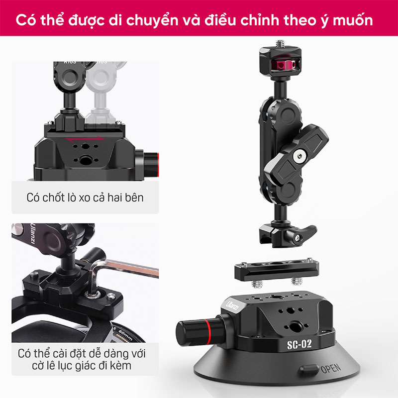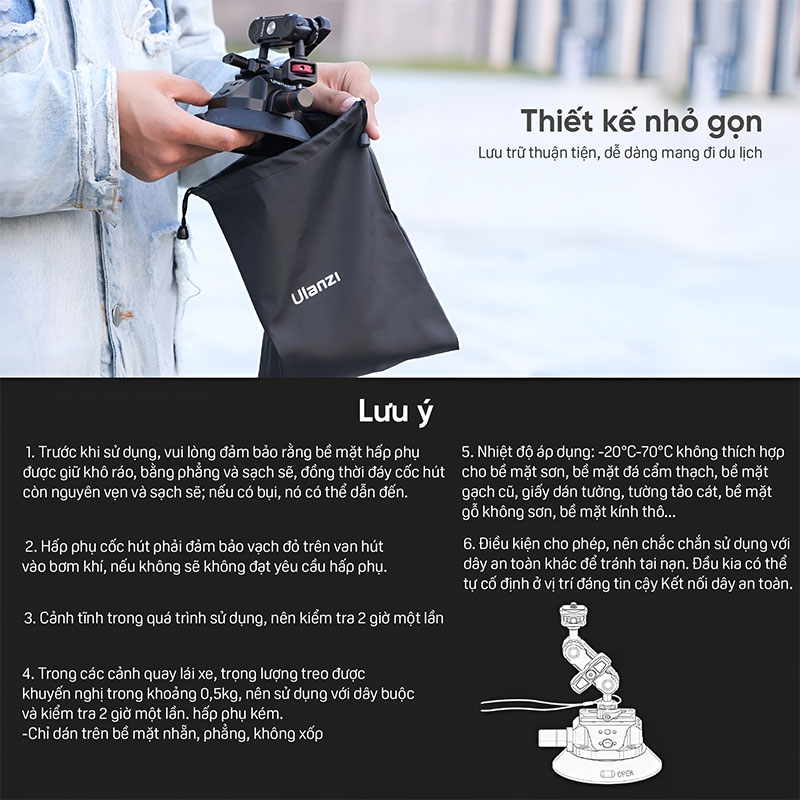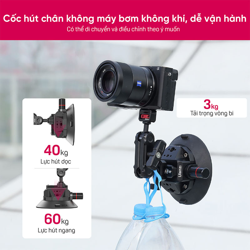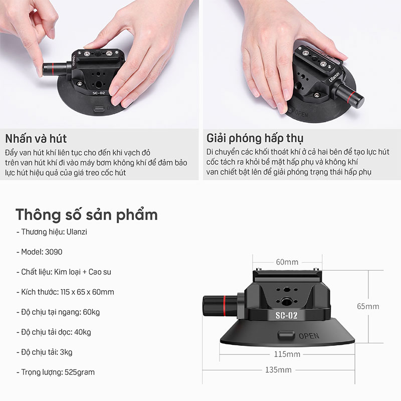 - Cốc hút chân không máy bơm không khí cấp công nghiệp: Có thể mang theo thiết bị lên đến 3kg. Lực hút dọc 40kg và lực hút ngang 60kg.Có thể di chuyển và điều chỉnh theo ý muốn.