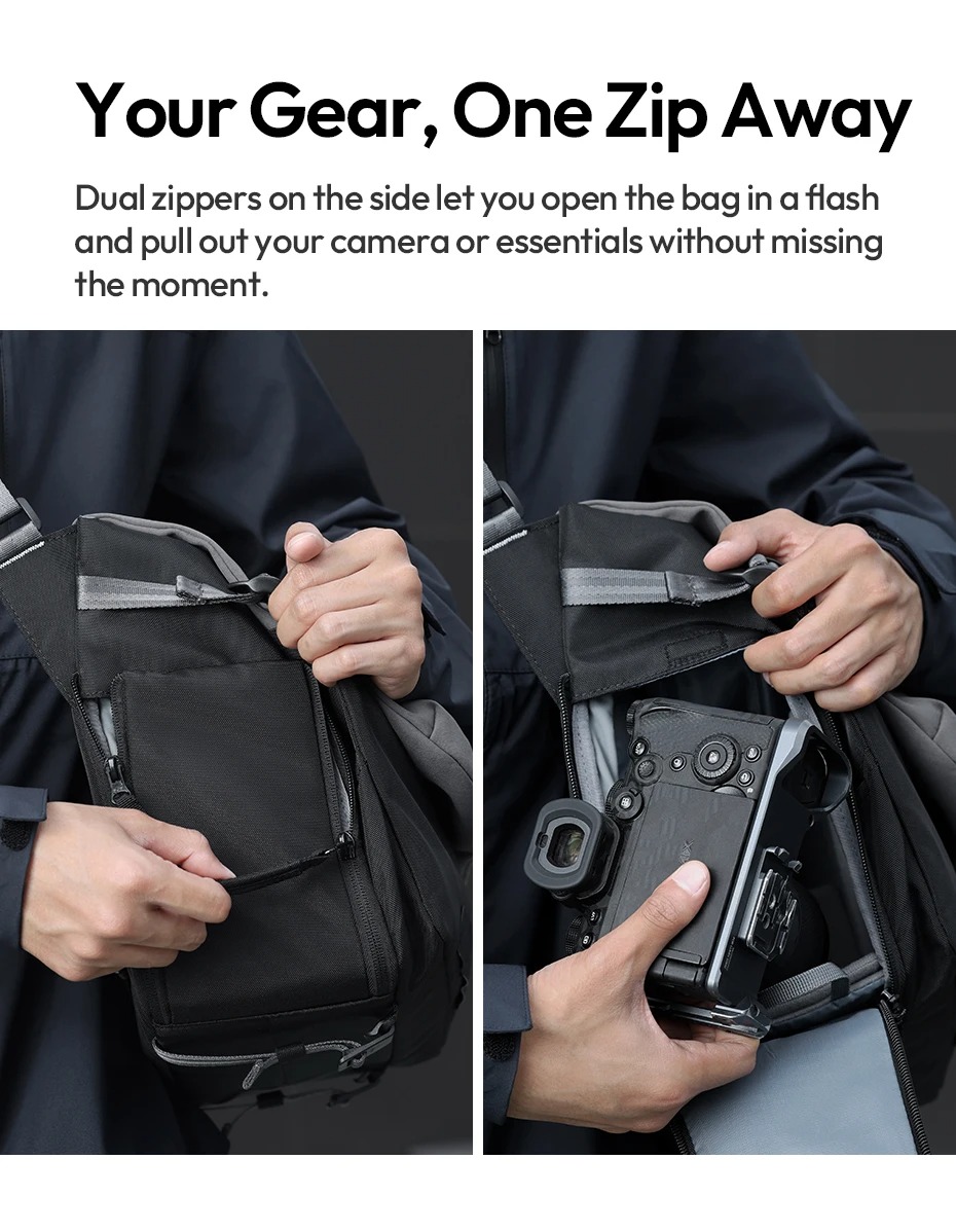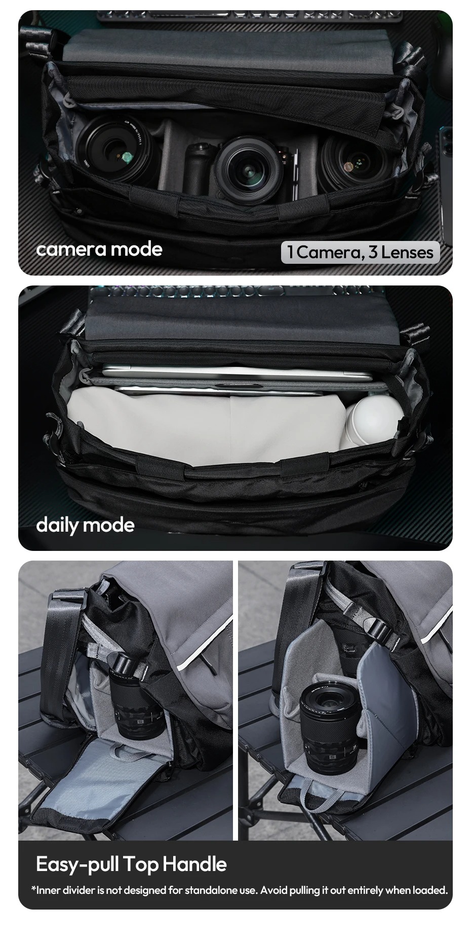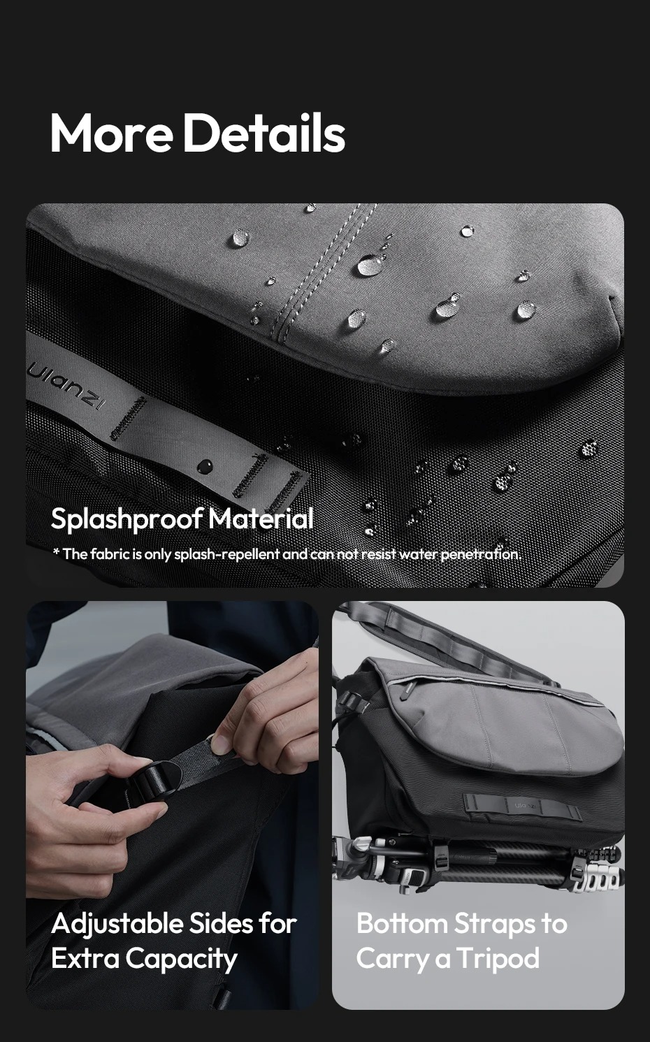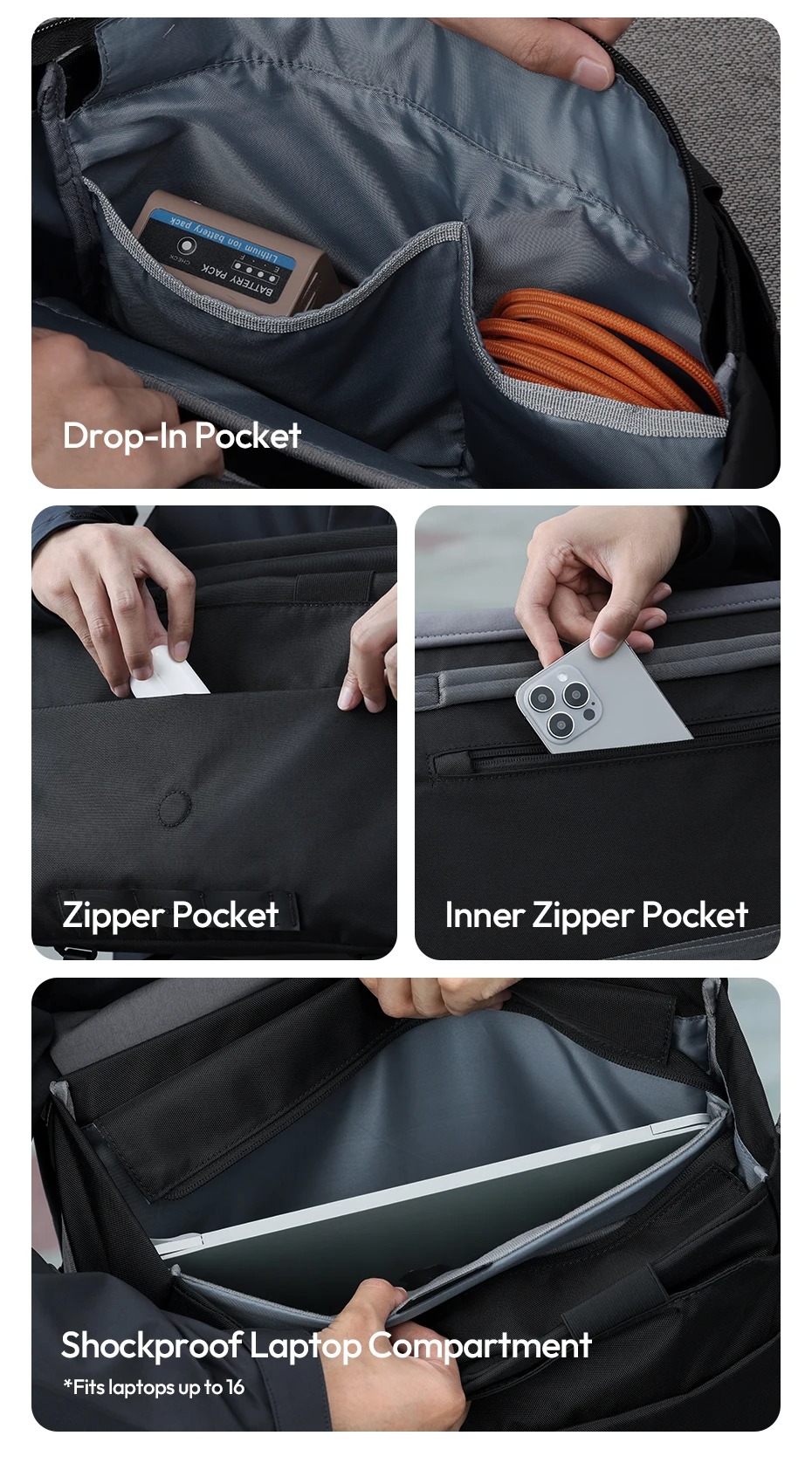 - Nhiều ngăn phụ nhỏ bên trong và bên ngoài, có thể đựng pin, sạc, dây cáp, thẻ nhớ, ví, điện thoại...