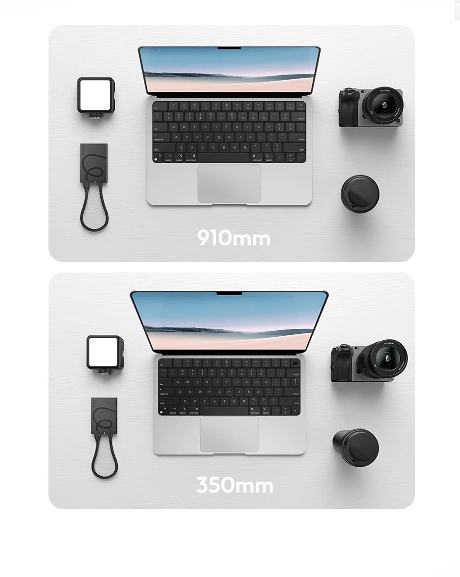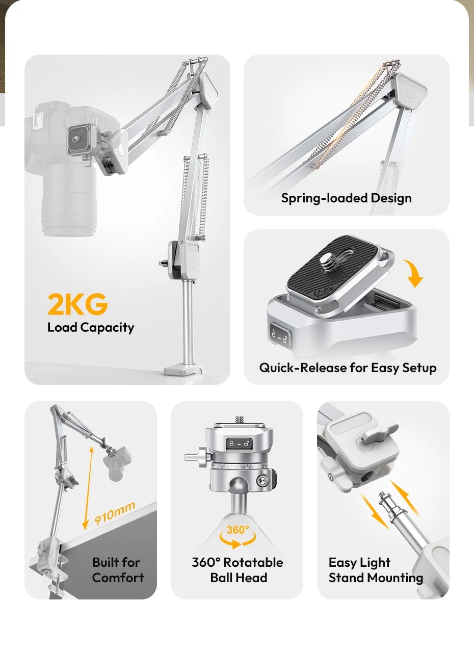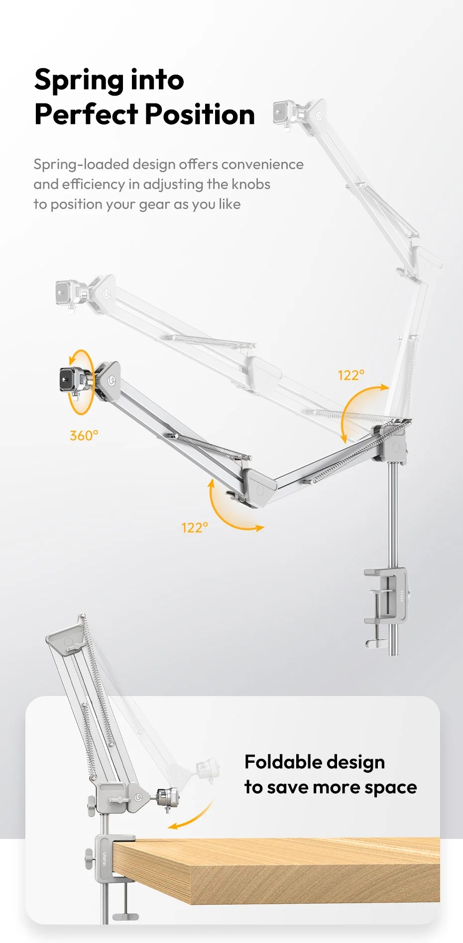 - Với cánh tay mở rộng lên đến 910mm, nó cung cấp góc nhìn từ trên xuống chân thực và chuyên nghiệp hơn một cách dễ dàng