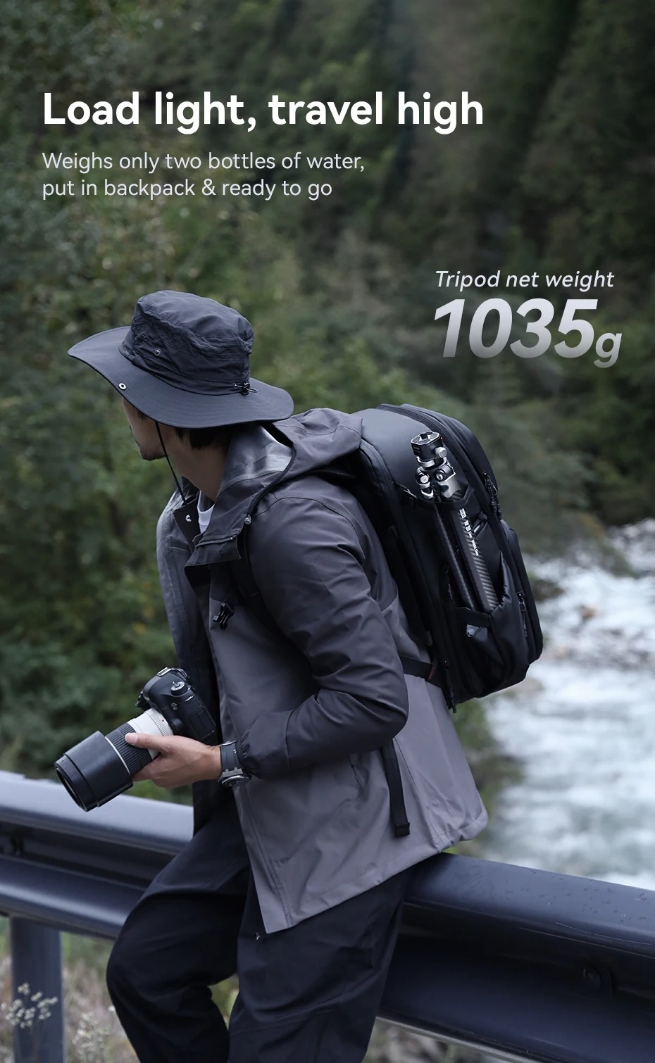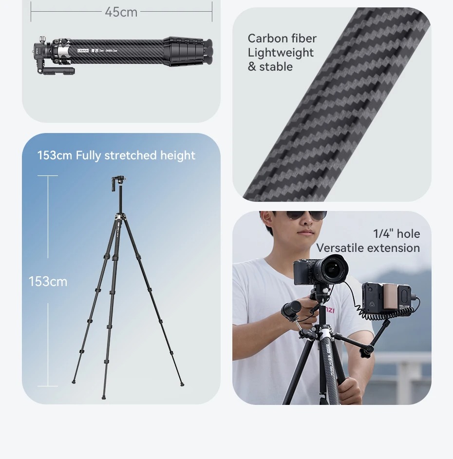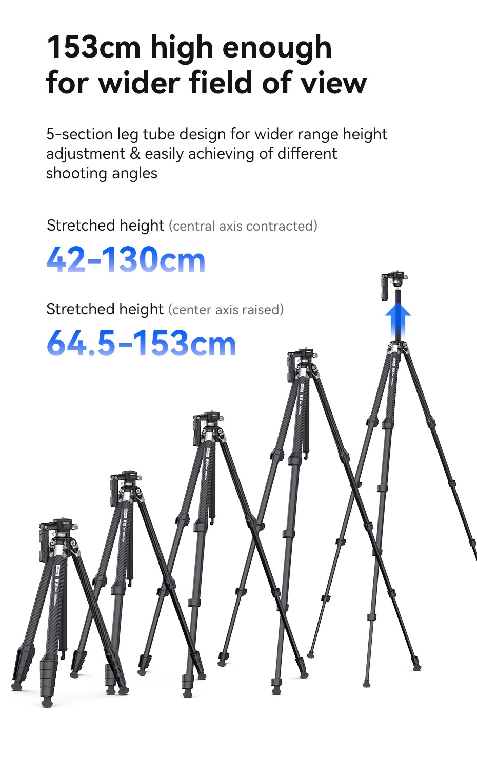 - Đủ cao 153cm cho trường nhìn rộng hơn: Thiết kế ống chân 5 phần để điều chỉnh độ cao trong phạm vi rộng hơn và dễ dàng đạt được các góc chụp khác nhau.
