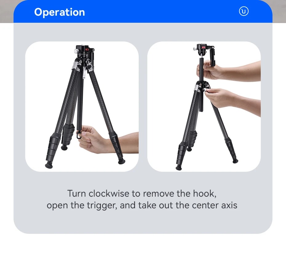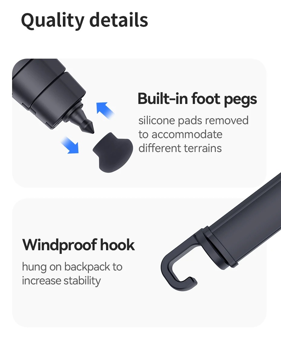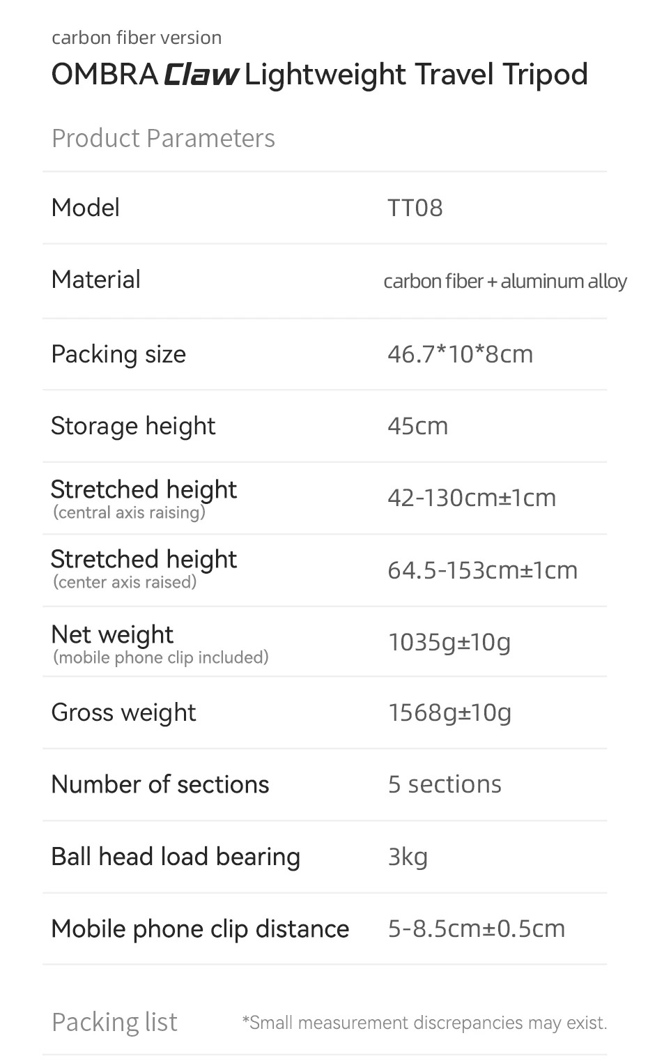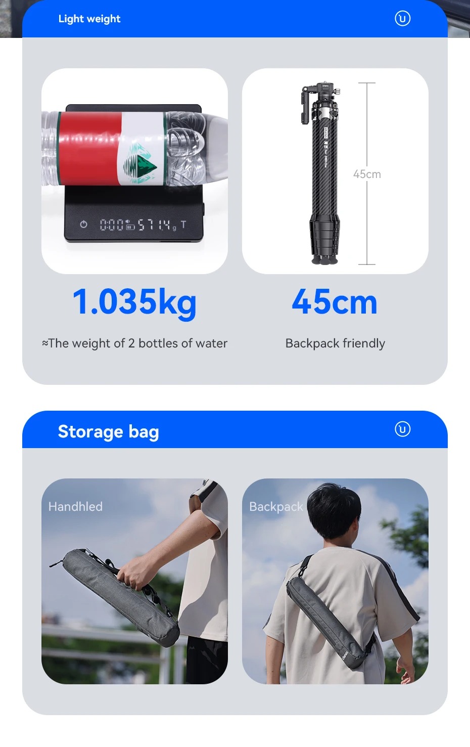 - Đủ cao 153cm cho trường nhìn rộng hơn: Thiết kế ống chân 5 phần để điều chỉnh độ cao trong phạm vi rộng hơn và dễ dàng đạt được các góc chụp khác nhau.