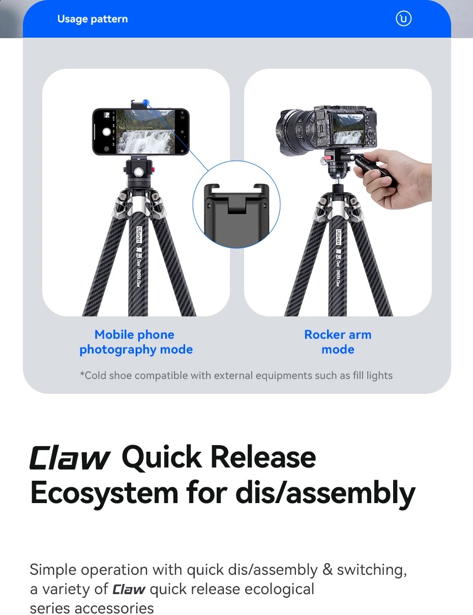- Hệ sinh thái phát hành nhanh Claw để tháo/lắp ráp: Hoạt động đơn giản với việc tháo/lắp ráp và chuyển đổi nhanh chóng, nhiều phụ kiện thuộc dòng sinh thái giải phóng nhanh CLAW.