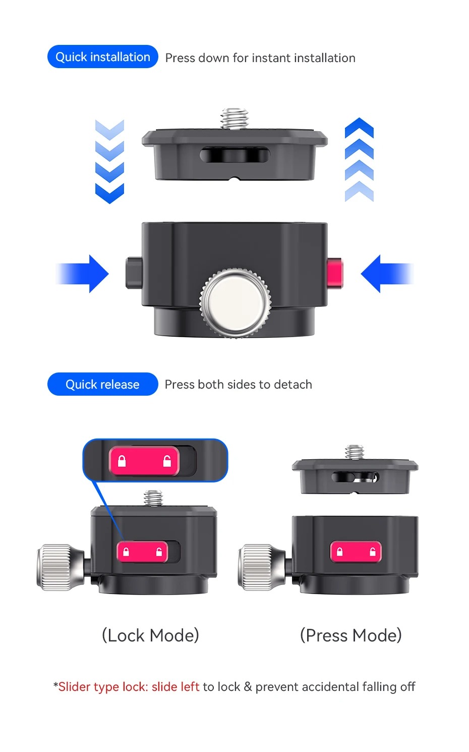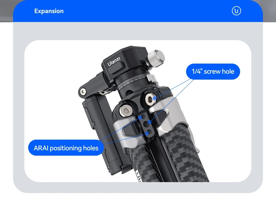 - Có lỗ vít 1/4" và lỗ định vị ARAI, nó tương thích với nhiều thiết bị.