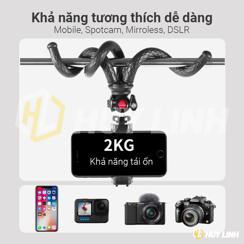 - Khả năng chịu tải lên đến 2kg, tương thích với điện thoại di động, gopro, máy ảnh không gương lật, máy ảnh Mirroless.