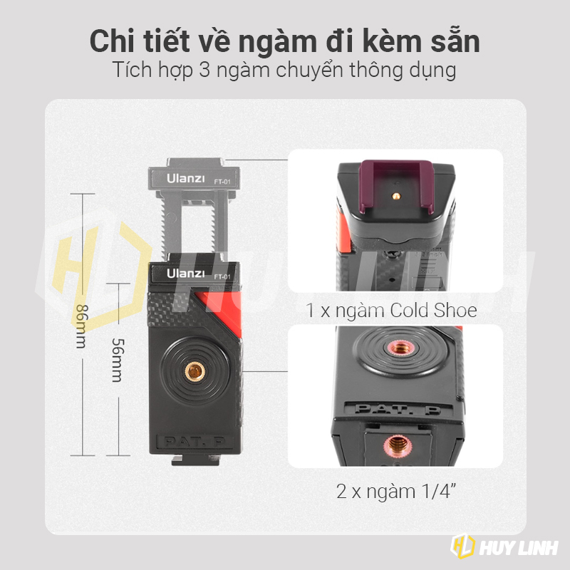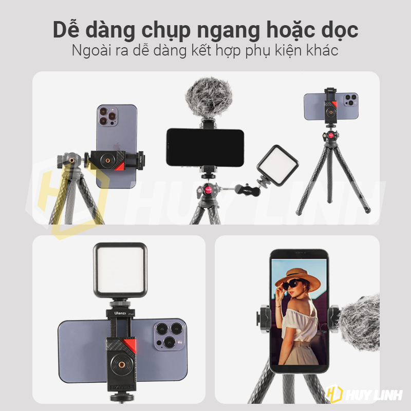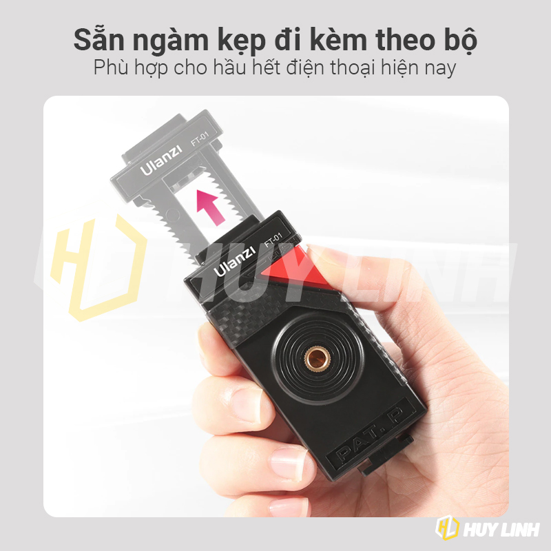 - Kẹp điện thoại đi kèm tương thích với các dòng điện thoại có kích thước ngang 56-86mm, điều chỉnh bằng nút bấm, thiết kế răng cưa một chiều giúp ổn định và chắc chắn hơn. Ngoài ra, còn tích hợp cold shoe và 2 lỗ vít 1/4" mở rộng cho phép gắn thêm được nhiều phụ kiện hơn.