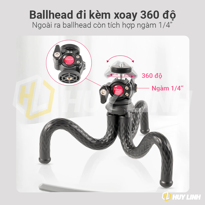 - Ren xoáy chuẩn 1/4" tương thích với các dòng máy DSLR nhỏ, gá kẹp điện thoại... lỗ vít 1/4" bên cạnh cho phép gắn thêm các phụ kiện hỗ trợ quay phim khác như micro, đèn led...ngoài ra, có thể tháo rời phần thân với chân tripod.