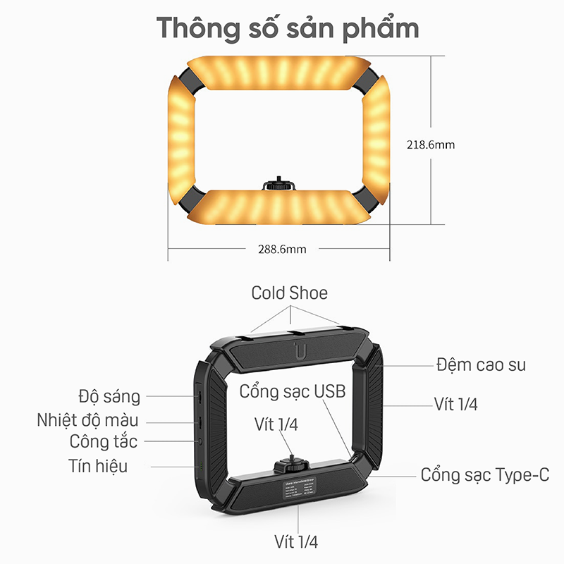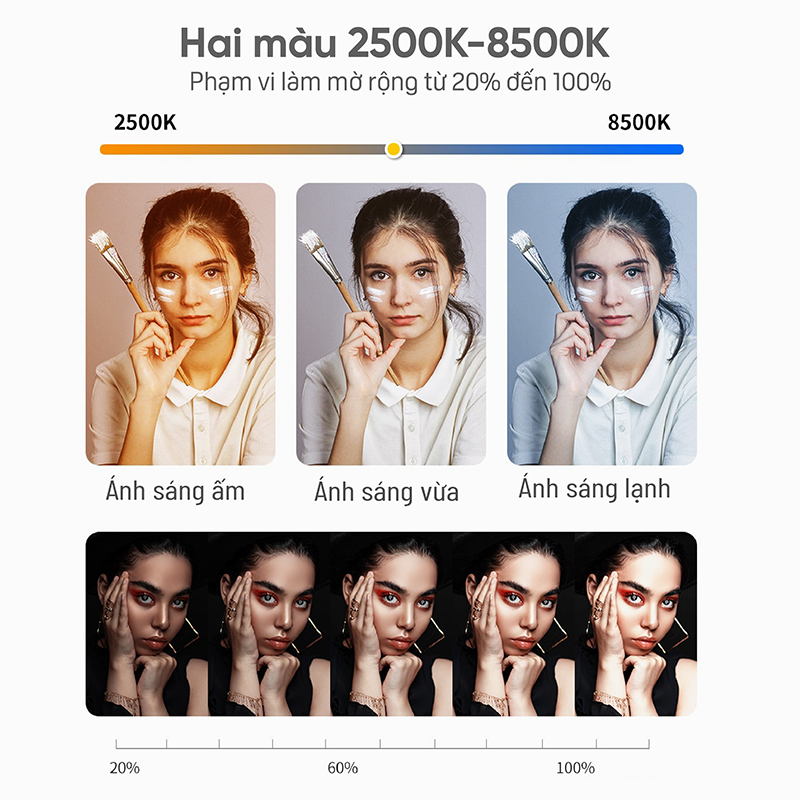 - Điều chỉnh liên tục và nhiệt độ màu rộng: Đèn vòng camera ULANZI U200 với phạm vi làm mờ rộng từ 20% đến 100%, có thể điều chỉnh hai màu 2500K-8500K. Điều chỉnh từ ánh sáng ấm (cam) sang ánh sáng mát (trắng) để có được tông màu da phù hợp với bạn.
