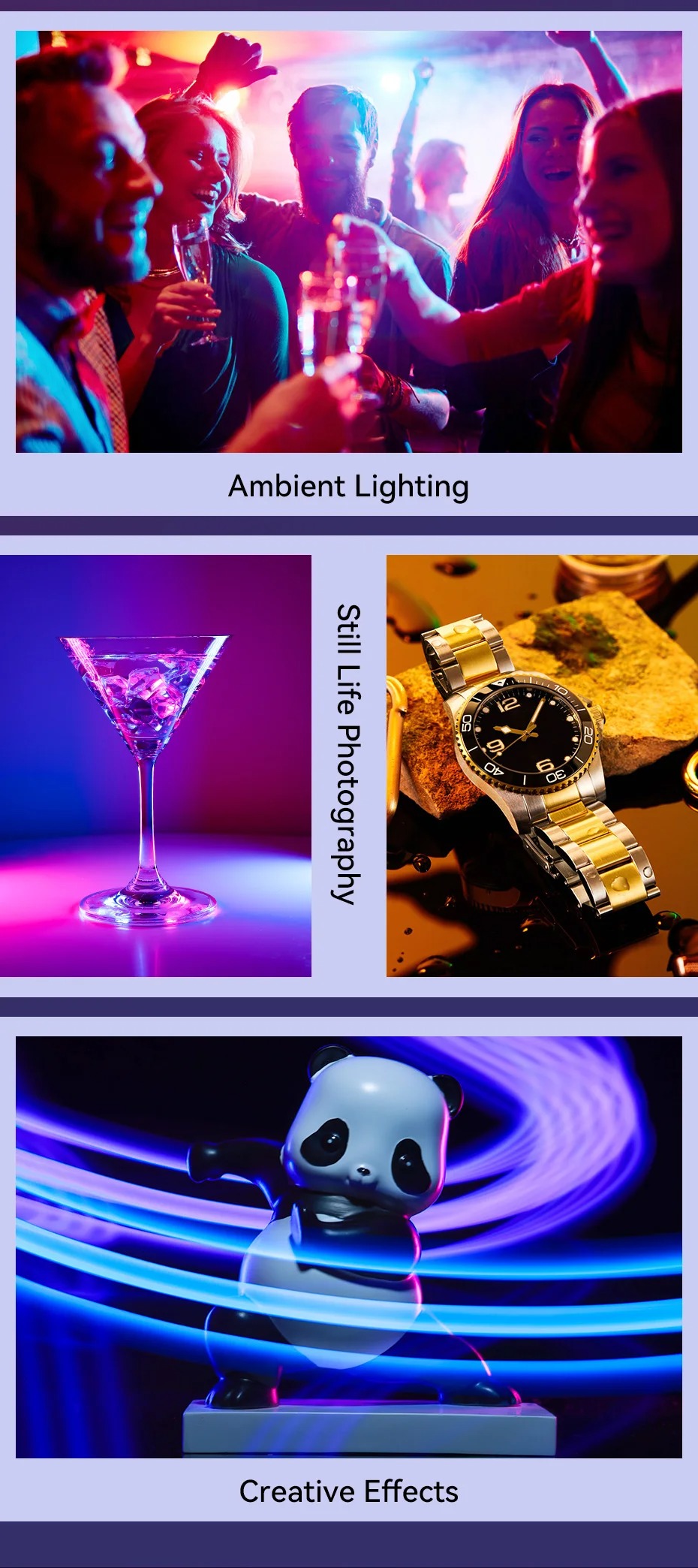 - 18 FX cho khả năng sáng tạo không giới hạn: Ánh sáng đủ màu RGB với 18 hiệu ứng cảnh chiếu sáng có sẵn. Hãy tô điểm cho bức ảnh của bạn bằng ánh sáng có thể tùy chỉnh ngay bây giờ.