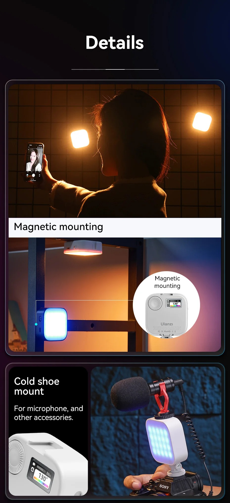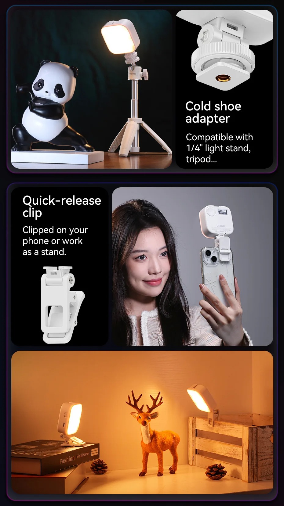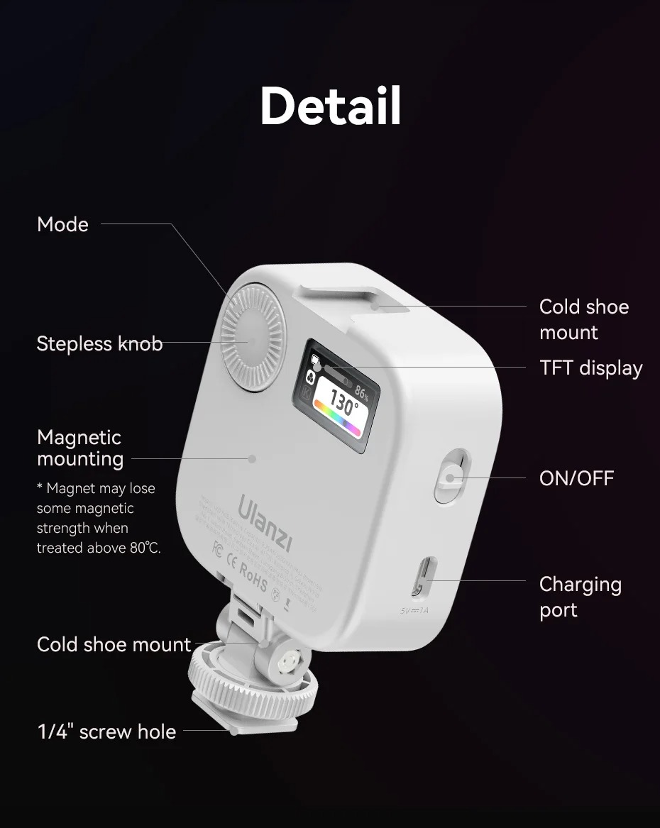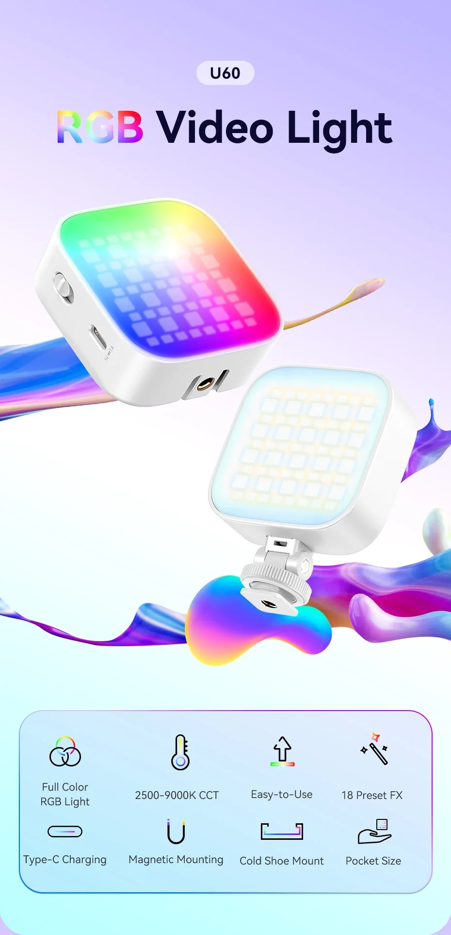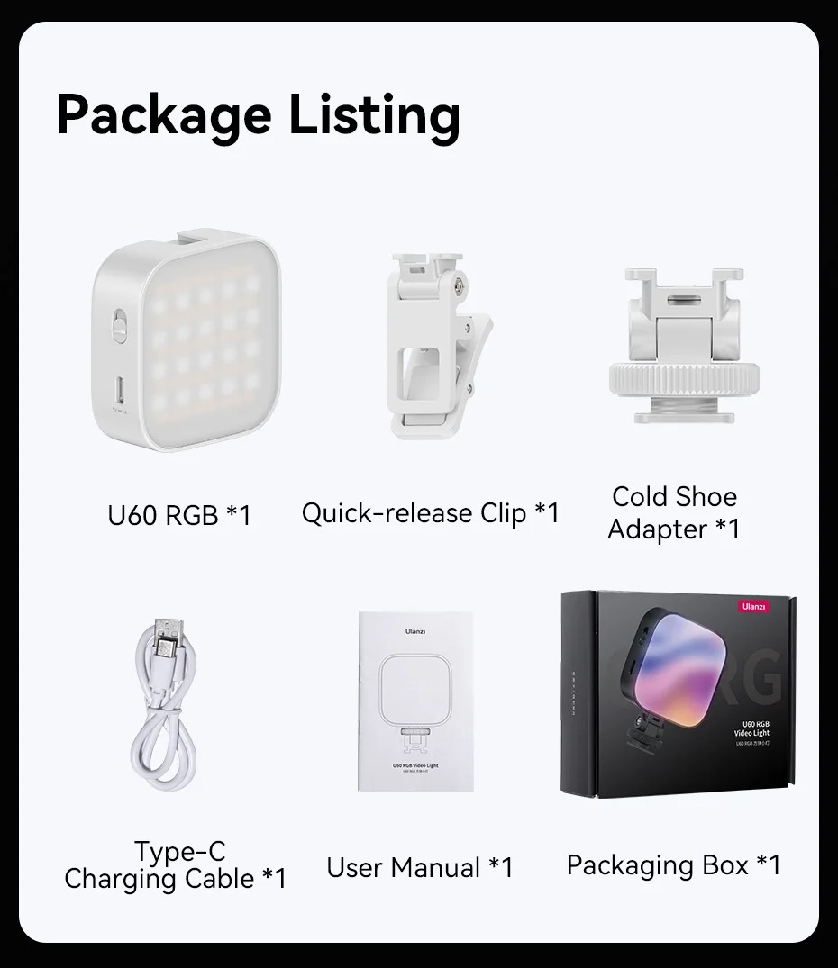 - Đèn Led Ulanzi U60 RGB với đế gắn đế lạnh, gắn từ tính, bộ chuyển đổi đế lạnh và kẹp tháo nhanh