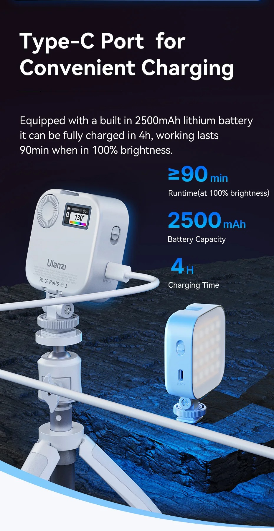 - Cổng Type-C để sạc thuận tiện: Được trang bị pin lithium 2500mAh tích hợp, có thể sạc đầy trong 4h, hoạt động kéo dài 90 phút khi ở độ sáng 100%.