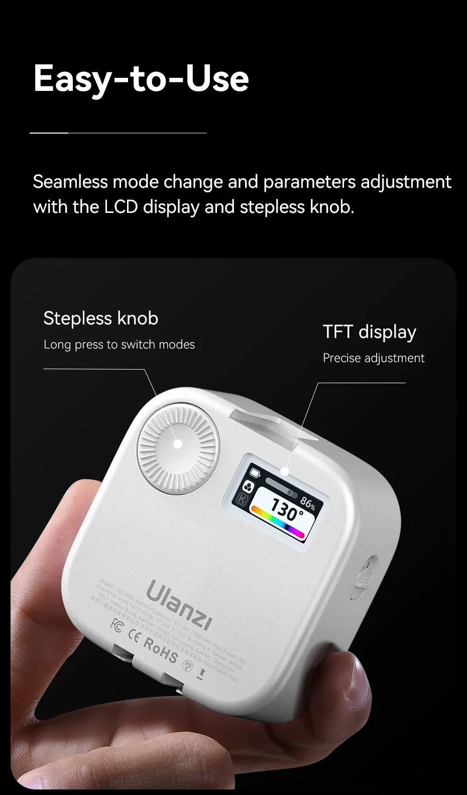 - Ulanzi U60 RGB có kích thước bỏ túi: Chỉ nặng 110g, U60 có thể dễ dàng bỏ vào túi để sử dụng khi di chuyển.