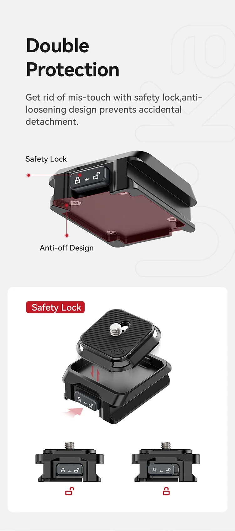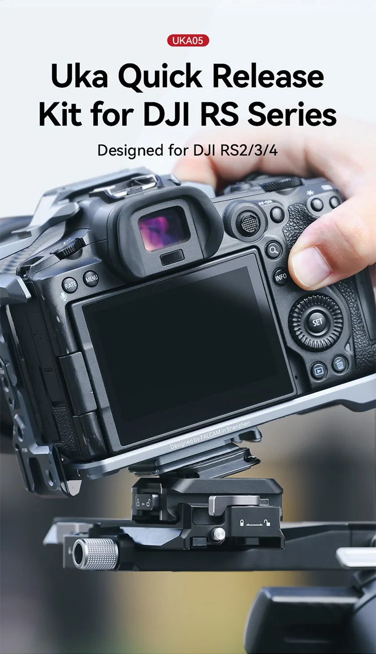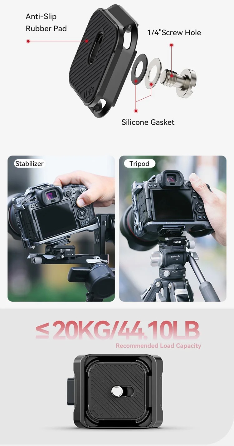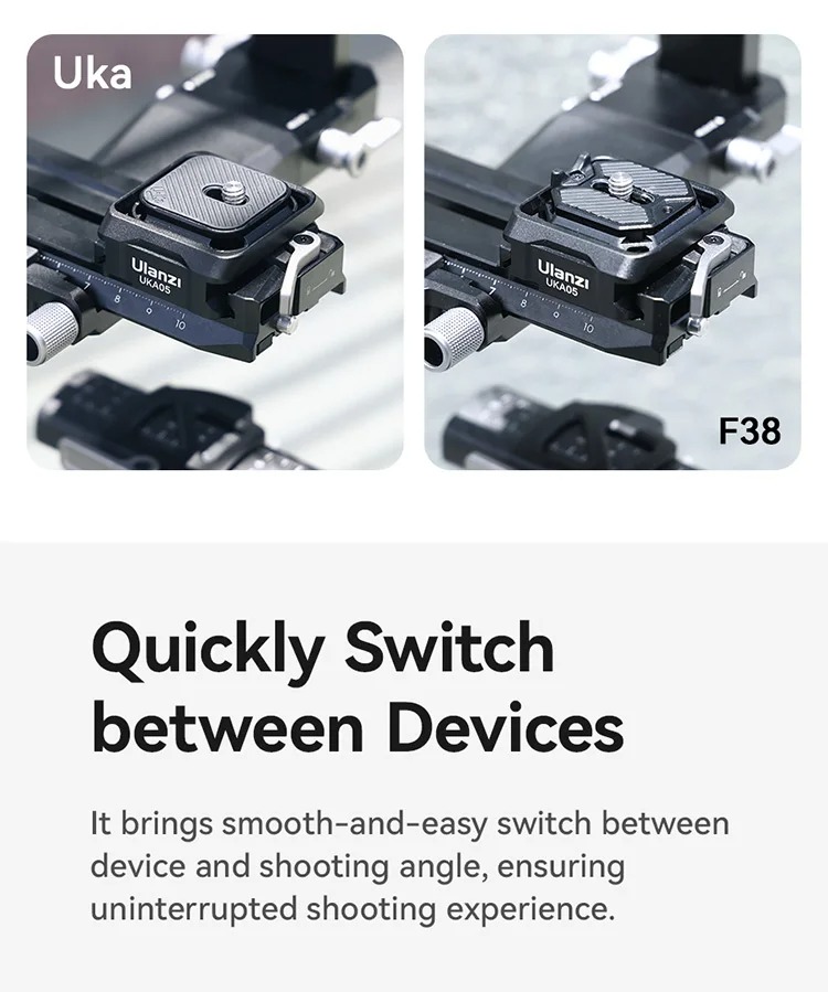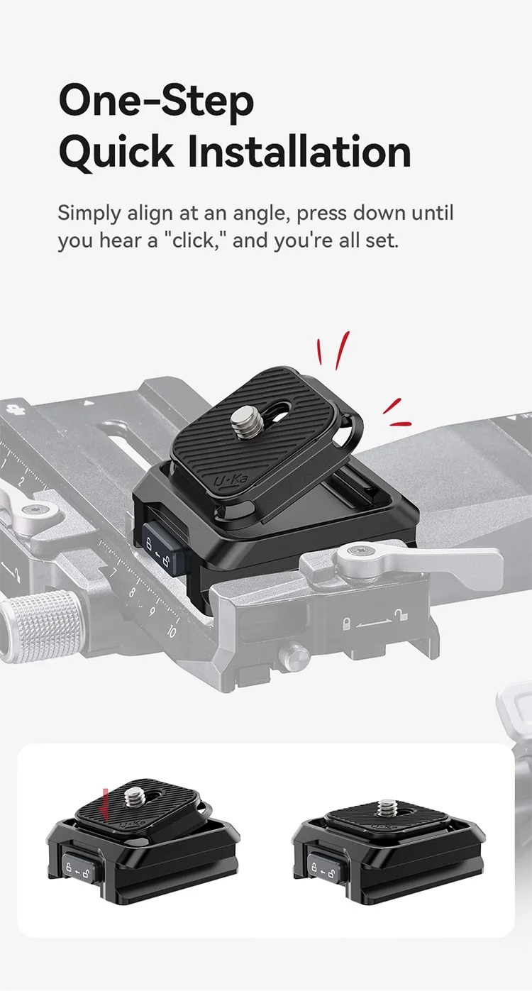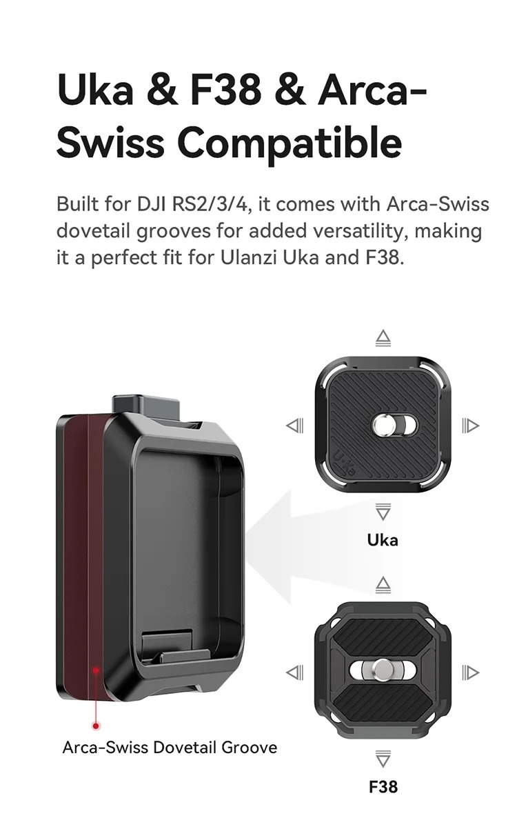 - Được thiết kế cho DJI RS2/3/4, sản phẩm có rãnh đuôi chim Arca-Swiss giúp tăng thêm tính linh hoạt, phù hợp hoàn hảo với Ulanzi Uka và F38.