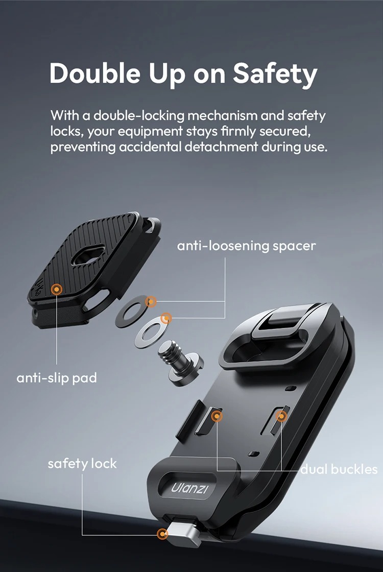 - Thiết kế 2 chốt khóa cùng tấm đệm chống trượt đảm bảo gấp đôi sự chắc chắn và an toàn khi lắp máy ảnh.