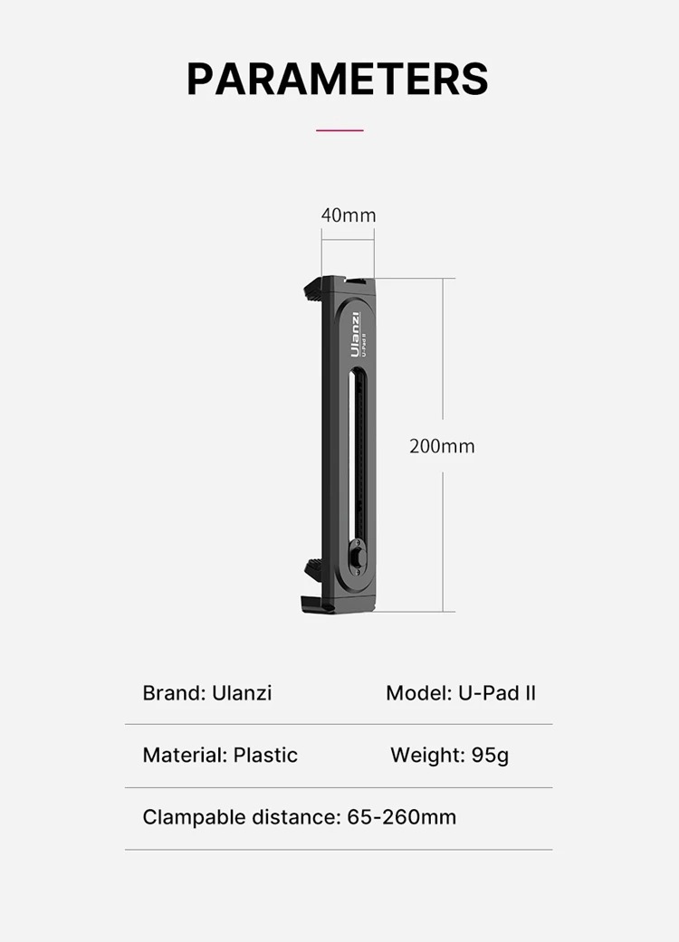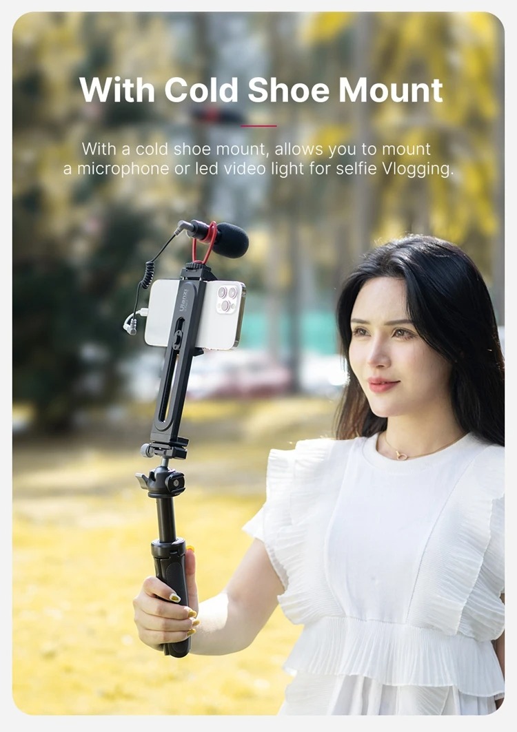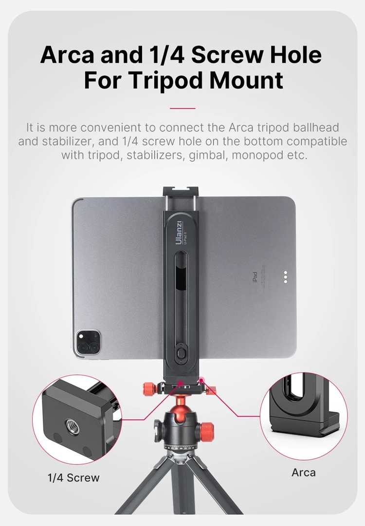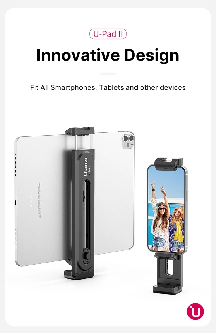 - Kẹp hai trong một cho điện thoại di động và máy tính bảng, với giao diện Cold shoe mout cho phép bạn gắn thêm Micro / Đèn LED hoặc các thiết bị khác