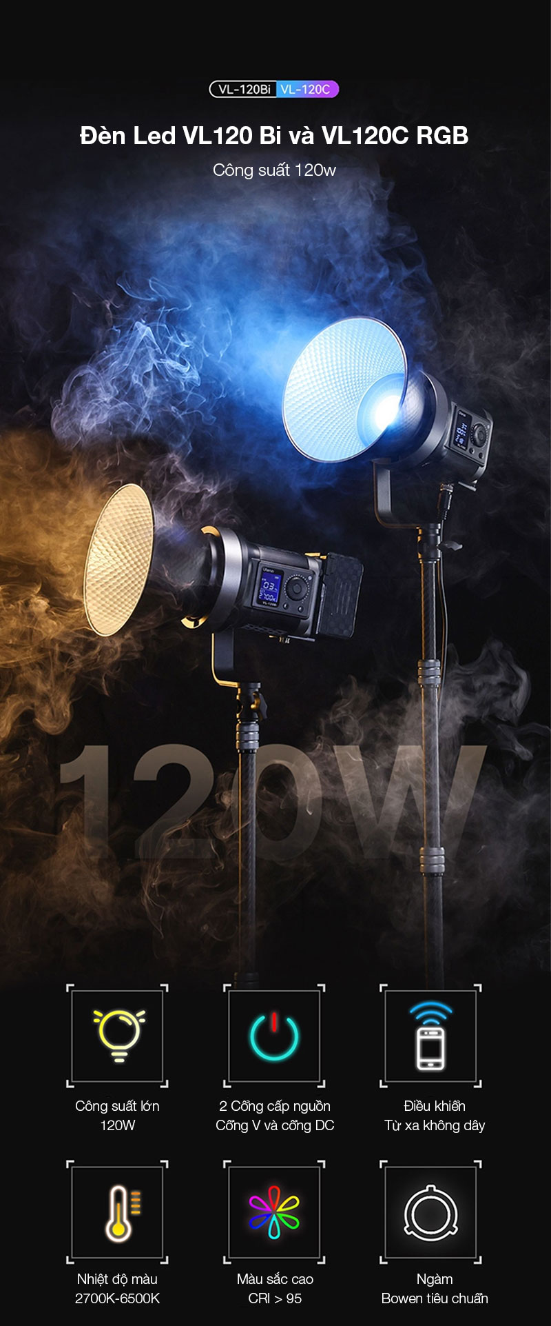 - Công suất cao 120W, chỉ số CRI > 95 đảm bảo chất lượng ánh sáng cho studio