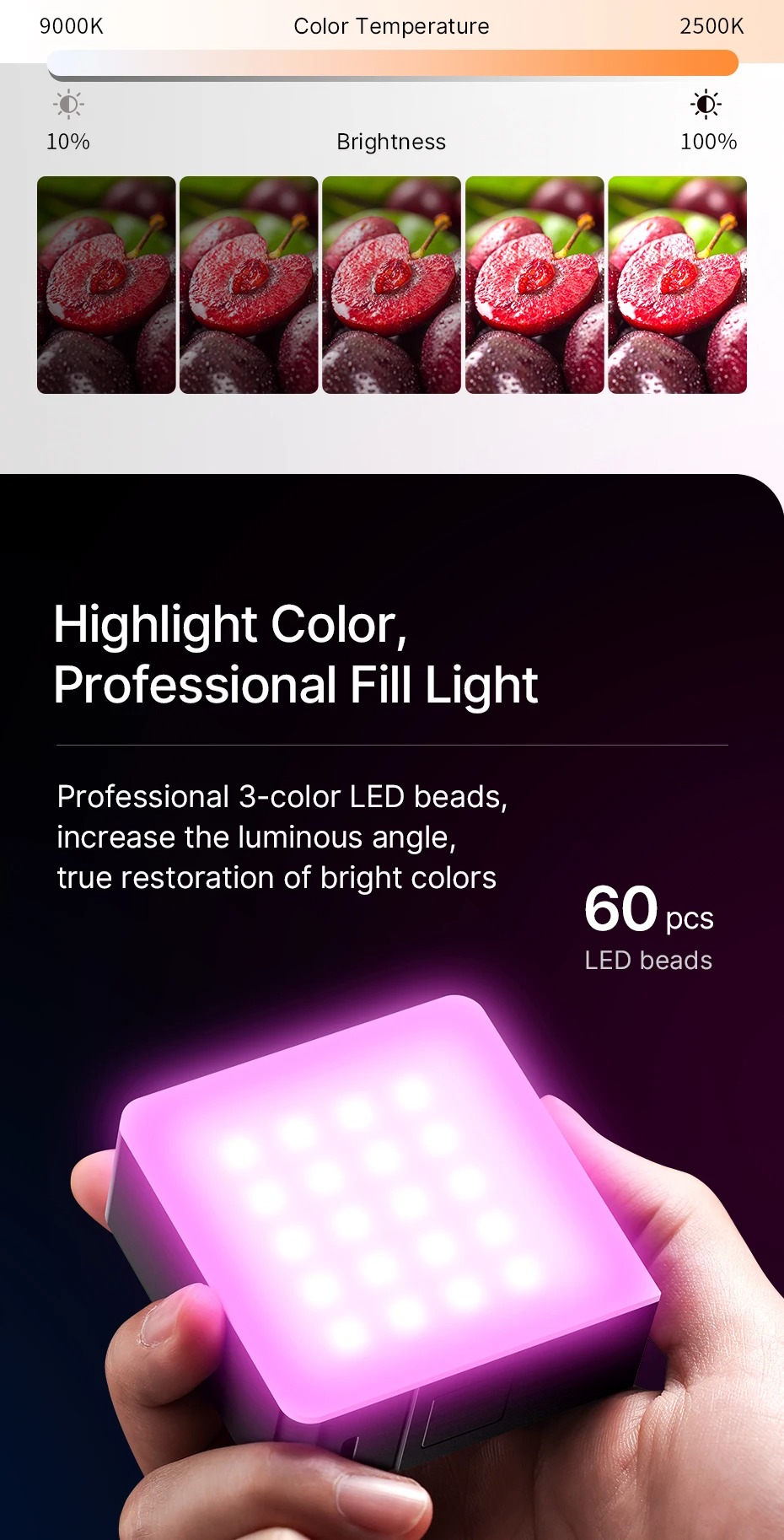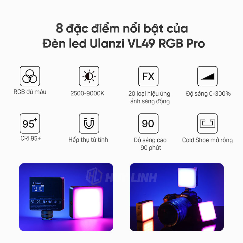Đèn Led mini Ulanzi VL49 Pro là mẫu đèn led cầm tay chụp ảnh, quay phim mới nhất của thương hiệu Ulanzi được nâng cấp từ Ulanzi VL49 RGB. Vẫn giữ thiết kế nhỏ gọn, cầm tay di động, tích hợp nam châm mặt ở mặt sau những Ulanzi VL49 RGB Pro được trạng bị thêm 2 tấm mút tản sáng hỗ trợ làm mềm, giảm chói sáng cho ánh sáng tự nhiên hơn. Dung lượng pin của Đèn mini RGB Ulanzi VL49 Pro tăng lên 2500mAh cho thời gian sử dụng liên tục ở cường độ cao là 90 phút. Đèn Ulanzi RGB VL49 Pro với ánh sáng RGB dễ dàng lựa chọn màu sắc theo ý muốn, đèn cũng có cả màu trắng và vàng.
