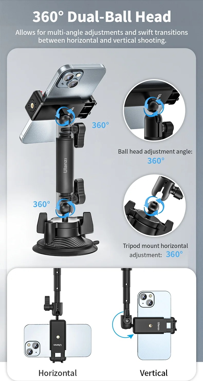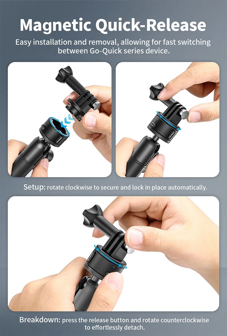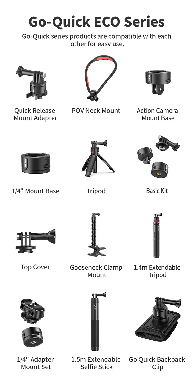 - Đi kèm với bộ chuyển đổi máy quay hành động, ren 1/4" và kẹp điện thoại, giúp sản phẩm tương thích với nhiều thiết bị quay phim khác nhau.