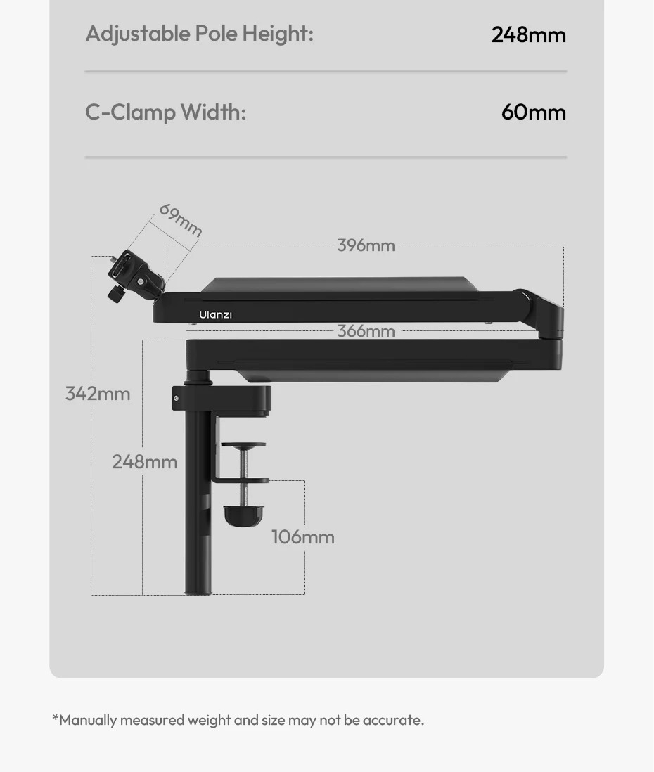 + Gấp gọn: 396mm (Cánh tay trên) + 366mm (Cánh tay dưới)