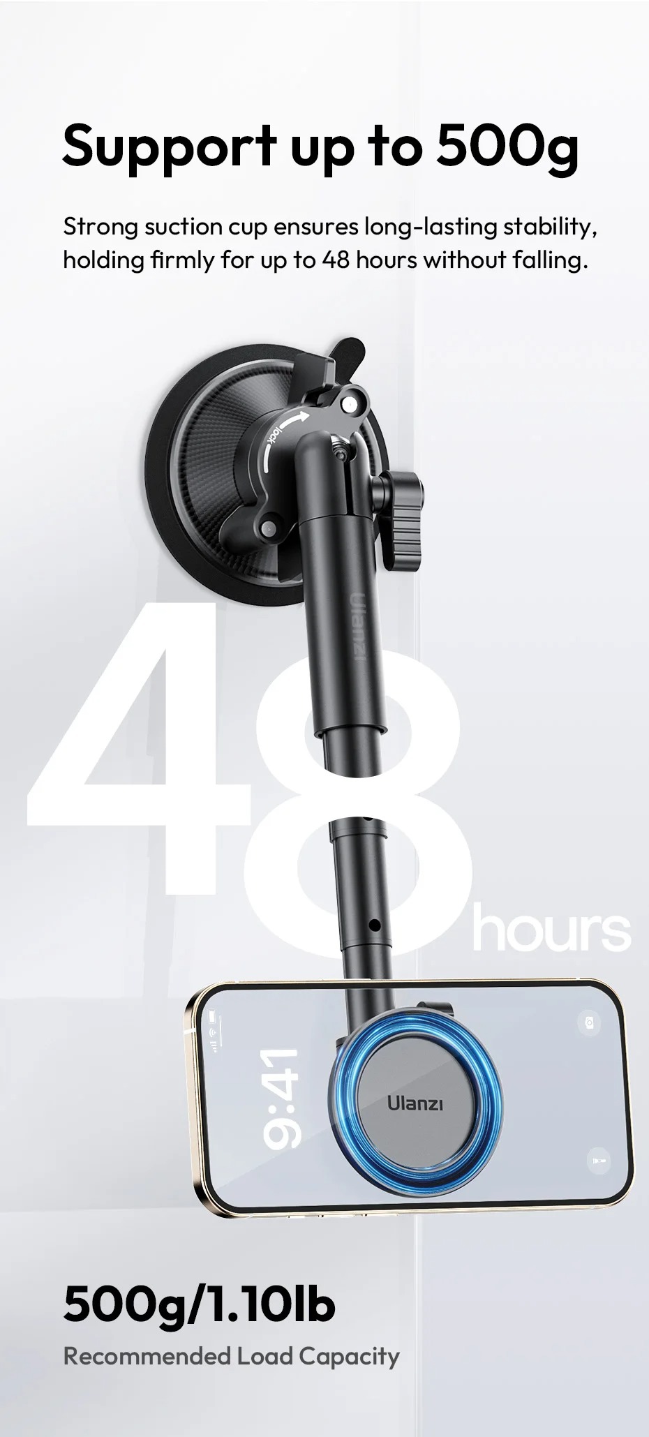 - Đế hút mạnh đảm bảo độ ổn định lâu dài, giữ chặt tới 48 giờ mà không bị rơi.