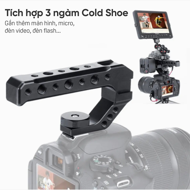 - Tích hợp 3 ngàmCold shoe mount để gắn thêm màn hình, micro, đèn video, đèn flash, bộ thu micro hoặc các phụ kiện khác, v.v
