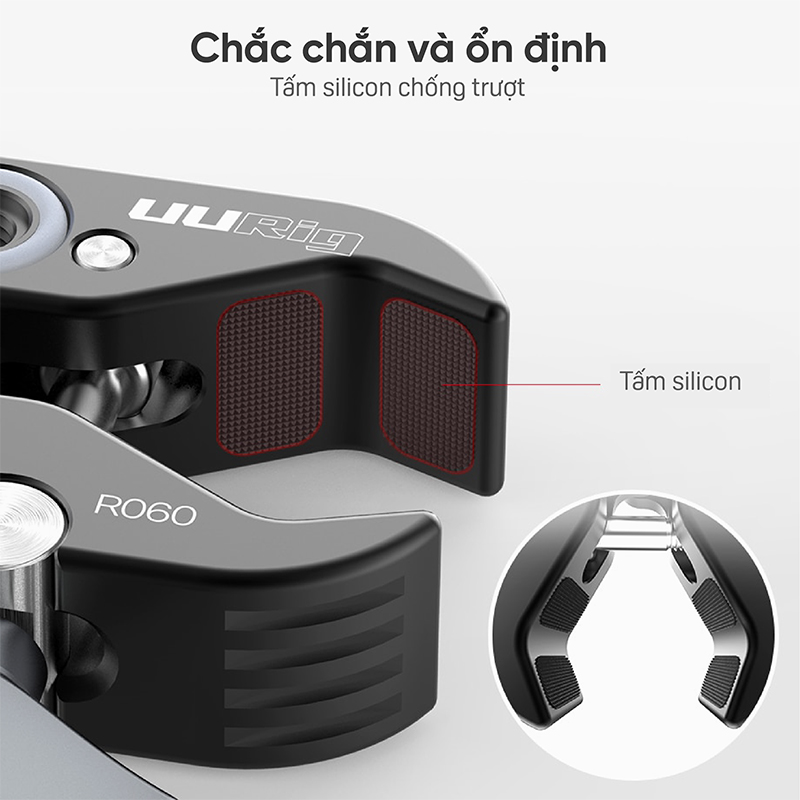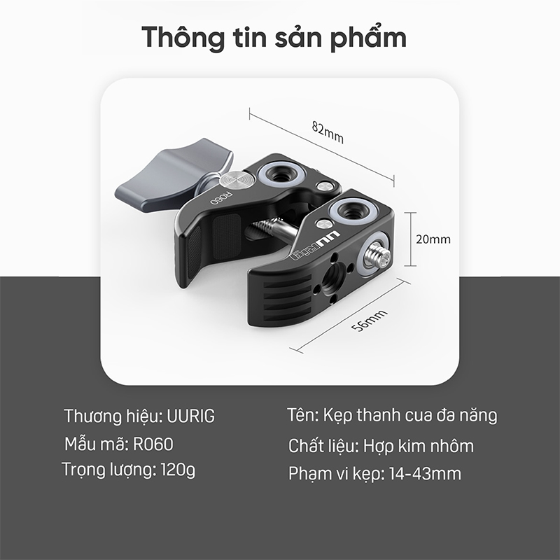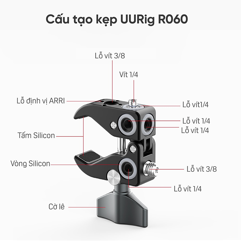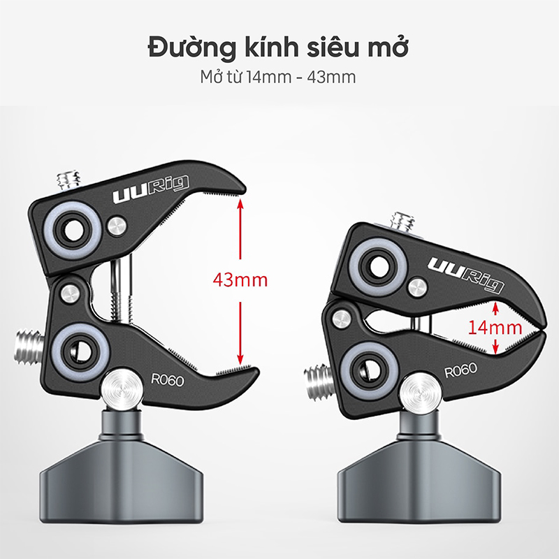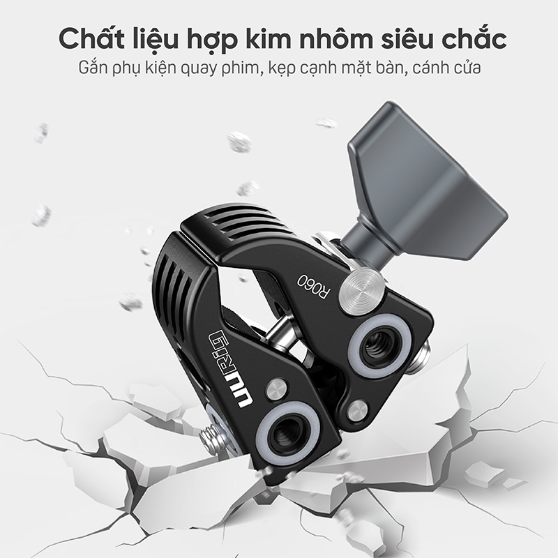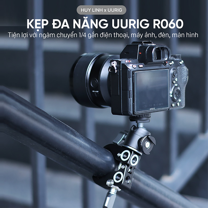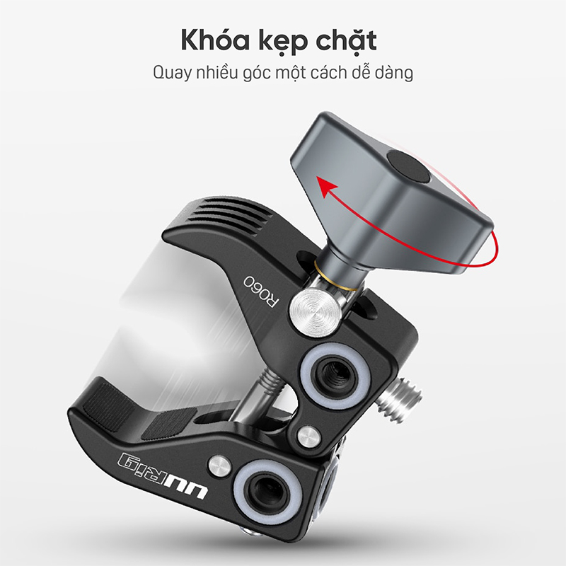 - Uurig R060 Kẹp kim loại siêu chắc gắn phụ kiện quay phim, dùng kẹp lên bề mặt phẳng như cạnh mặt bàn, cảnh cửa, thanh sắt ... hoặc vị trí cần kẹp vào để gắn phụ kiền đèn led quay phim, máy ảnh kết hợp ballhead đầu 1/4 hoặc thông qua tay nối 2 đầu ballhead 1/4