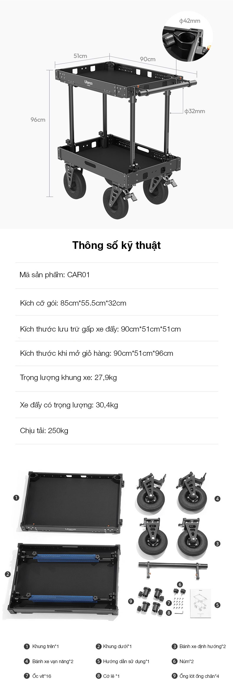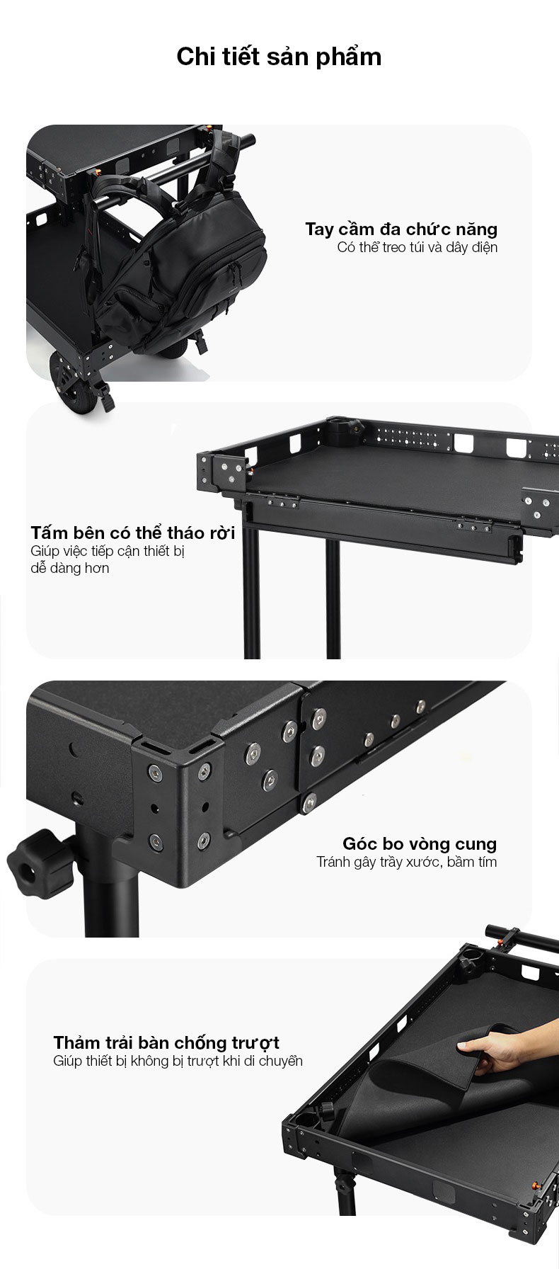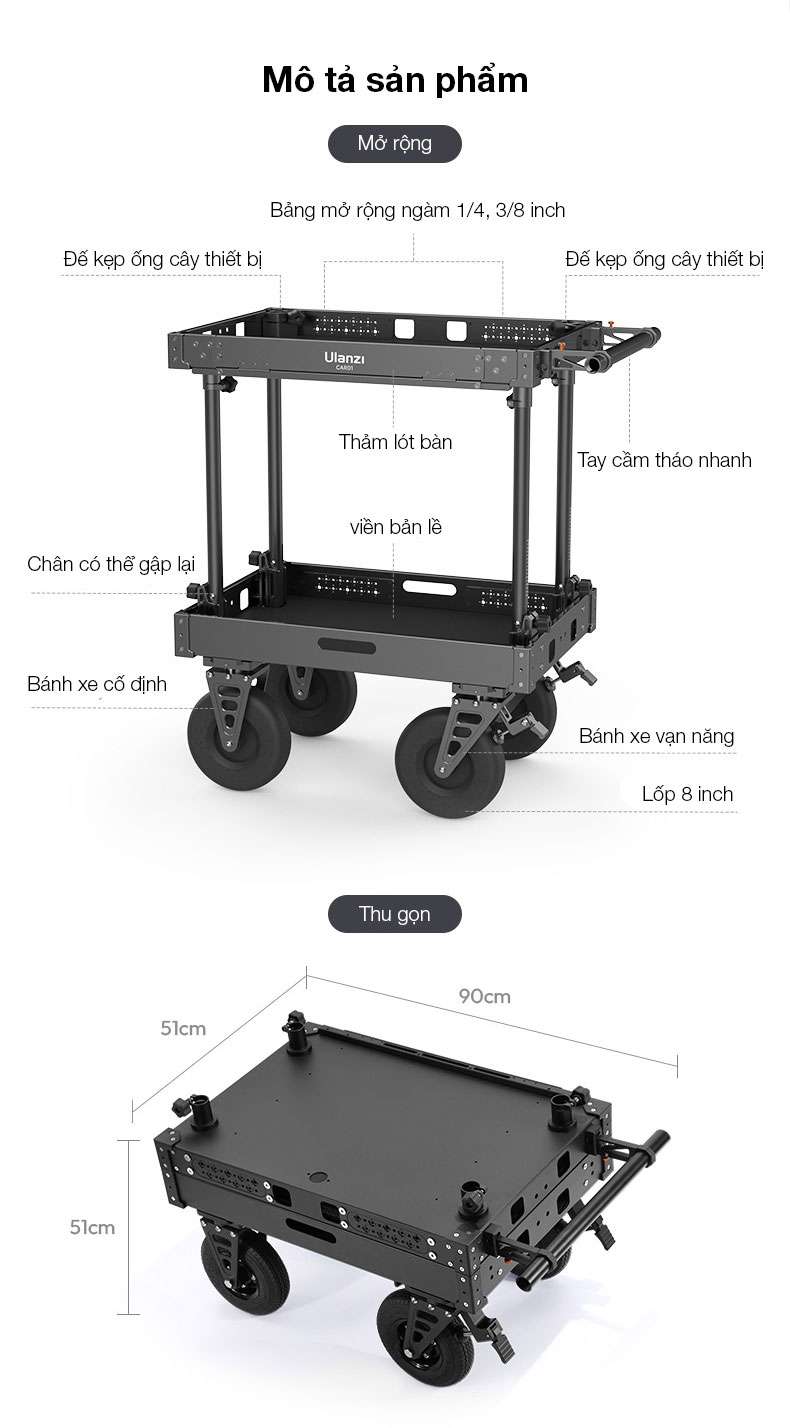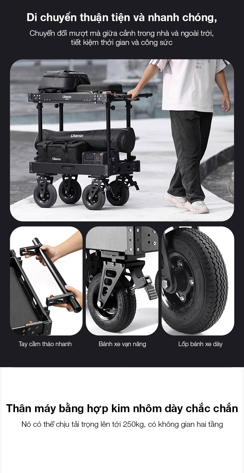 - Được làm từ chất liệu hợp kim nhôm, tải trọng 250kg với thiết kế 2 tầng có thể vận chuyển thiết bị một cách an toàn