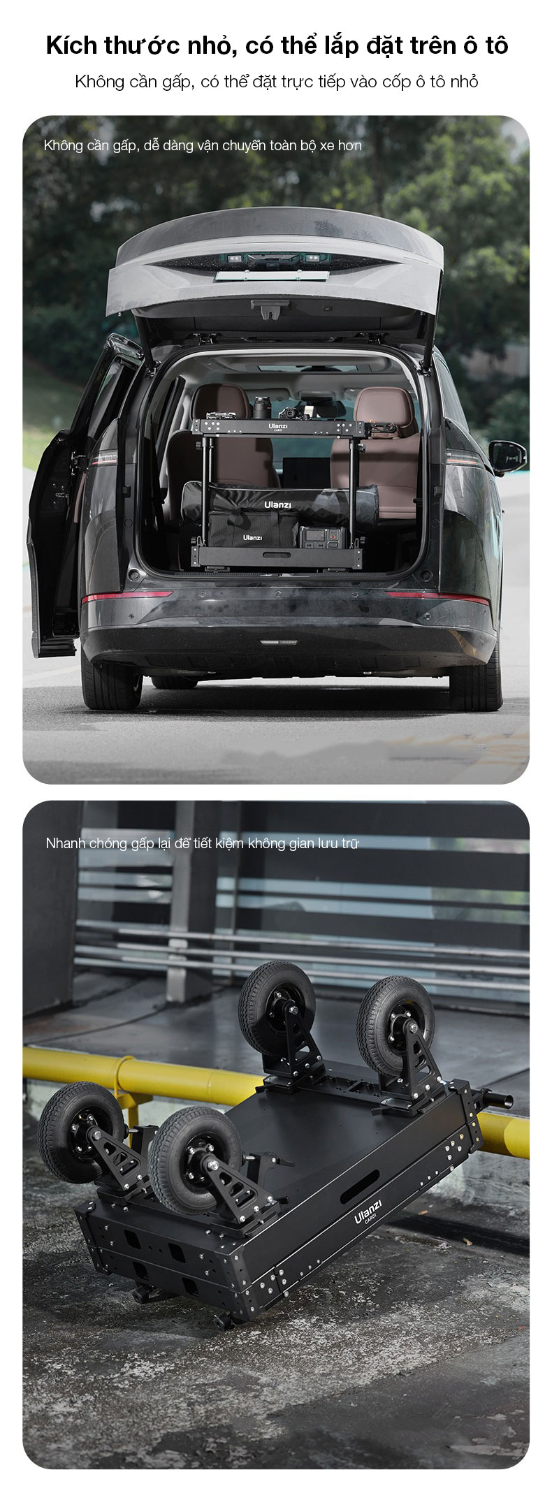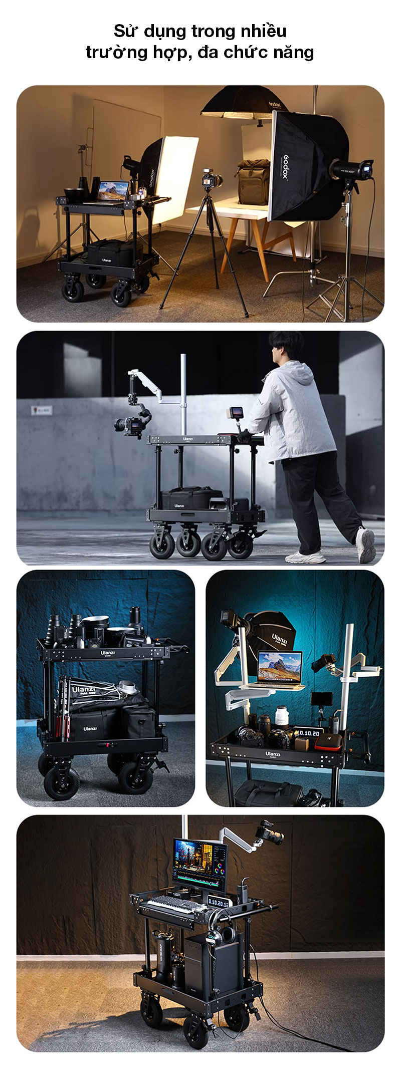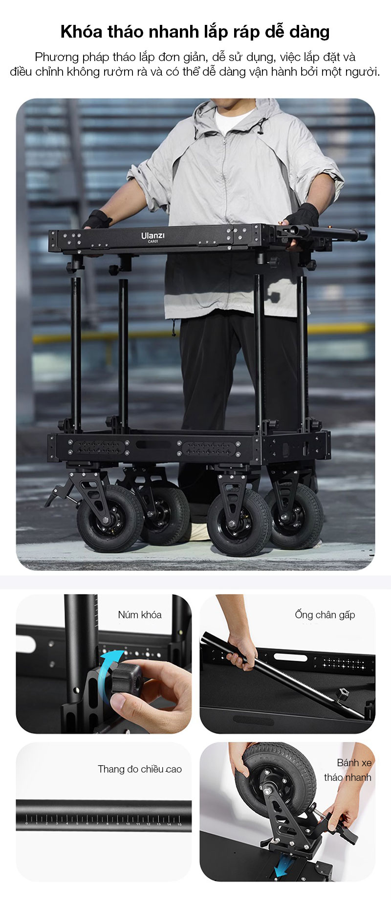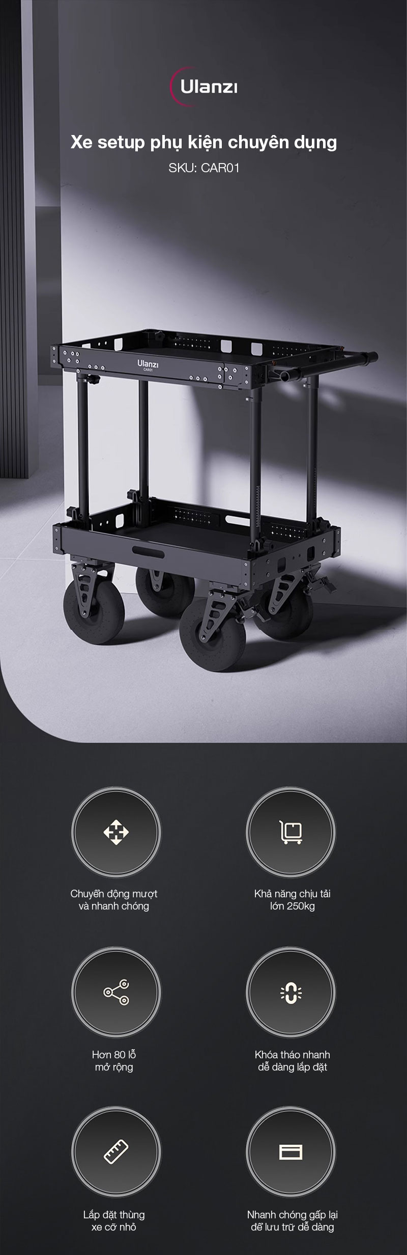 - Được làm từ chất liệu hợp kim nhôm, tải trọng 250kg với thiết kế 2 tầng có thể vận chuyển thiết bị một cách an toàn