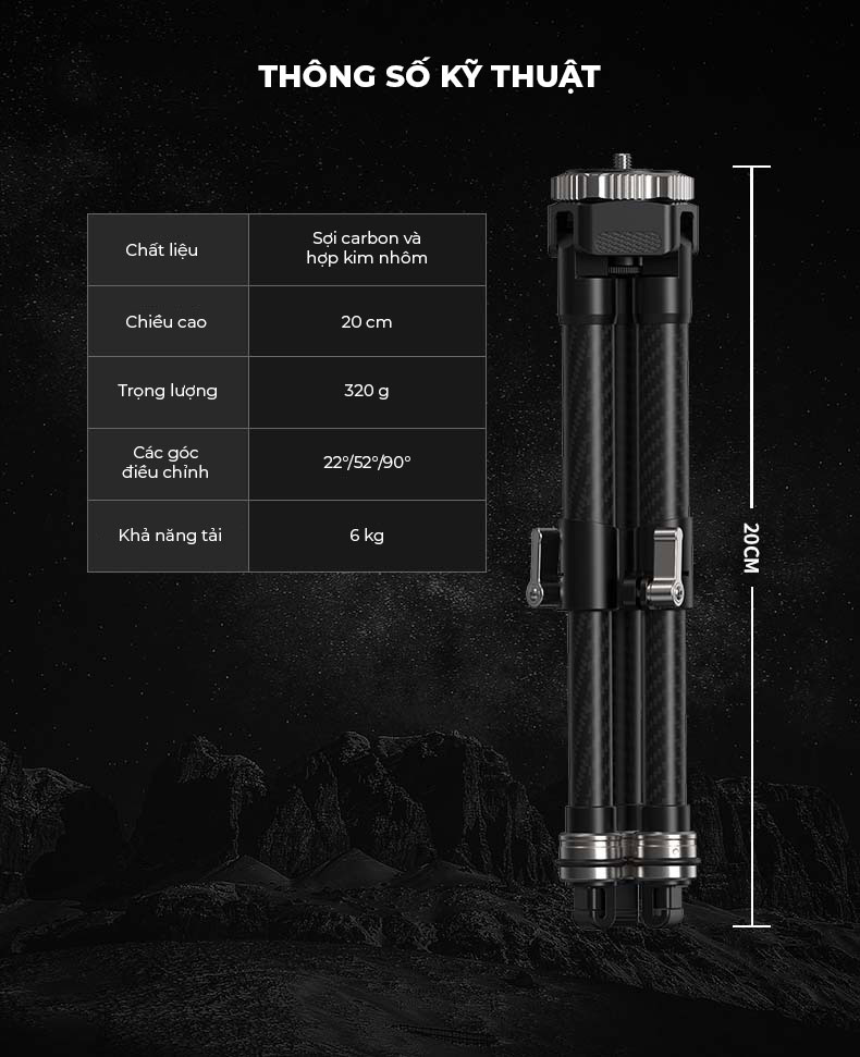 - Chịu tải: 35 kg (Gắn trên chân máy) / 6 kg (Khi sử dụng như chân máy mini)